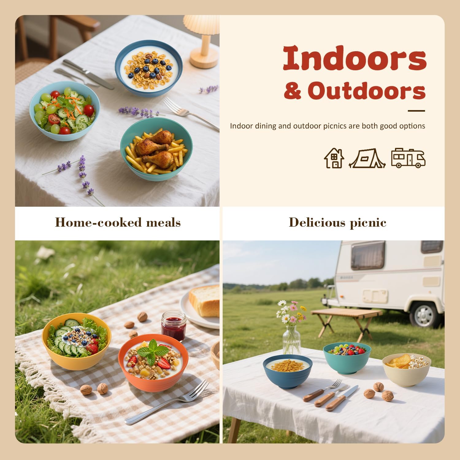 • 【𝗜𝗻𝗱𝗼𝗼𝗿𝘀 & 𝗢𝘂𝘁𝗱𝗼𝗼𝗿𝘀 𝗨𝘀𝗶𝗻𝗴】- These bowls are lightweight and unbreakable,featuring a smooth surface that makes cleaning effortless.Ideal portable bowls sets for camping,picnic,RV trips, and outdoor adventures.