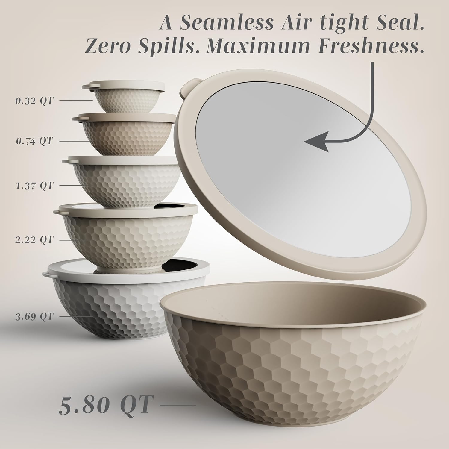 • Set includes 6 plastic bowls and 6 TPR lids; Bowl capacity of 0.32 QT, 0.74 QT, 1.37 QT, 3.69 QT and 5.8 QT.
