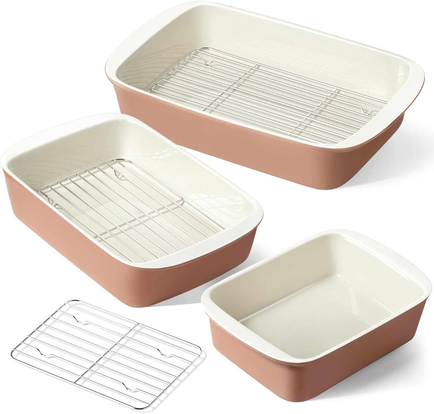 LE TAUCI Deep Casserole Dishes for Oven, 13.7”x9.6” Ceramic Baking Dish Set with Roasting Racks, Large Lasagna Pans with Handles, Rectangular Bakeware as Gift for Mom, Dusty Pink(4.6QT/3.0QT/1.6QT), Set of 3