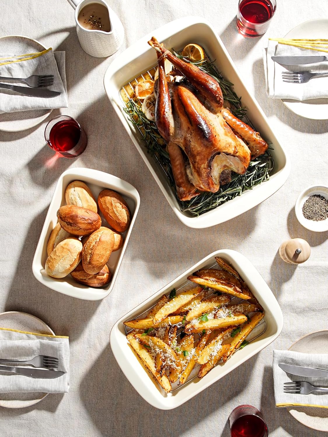 • Drip Racks for Healthier, Crispier Cooking: Each baking dish includes a matching oil-drip rack, perfect for roasting meats, bacon, and more. The racks help reduce excess grease, allowing you to cook delicious, healthier, and crispier meals