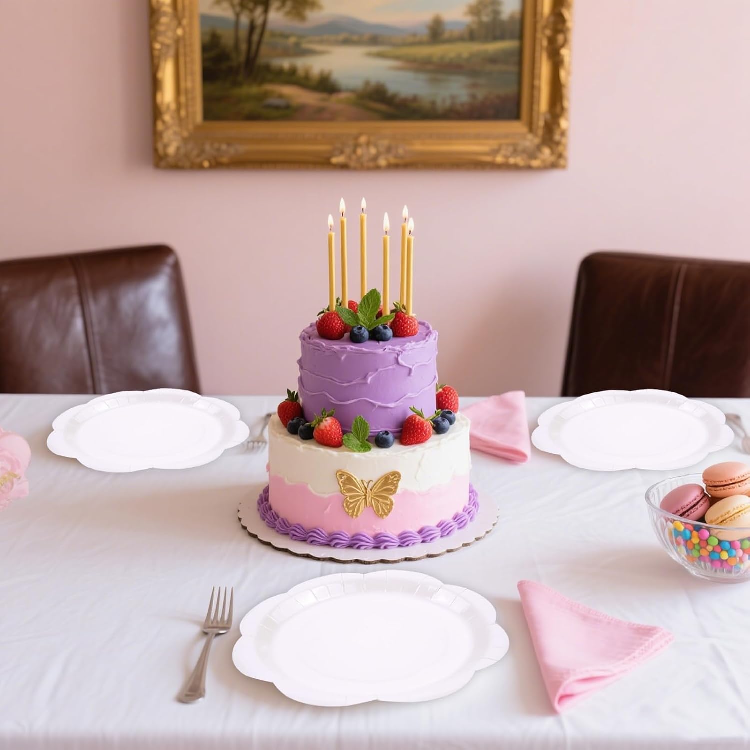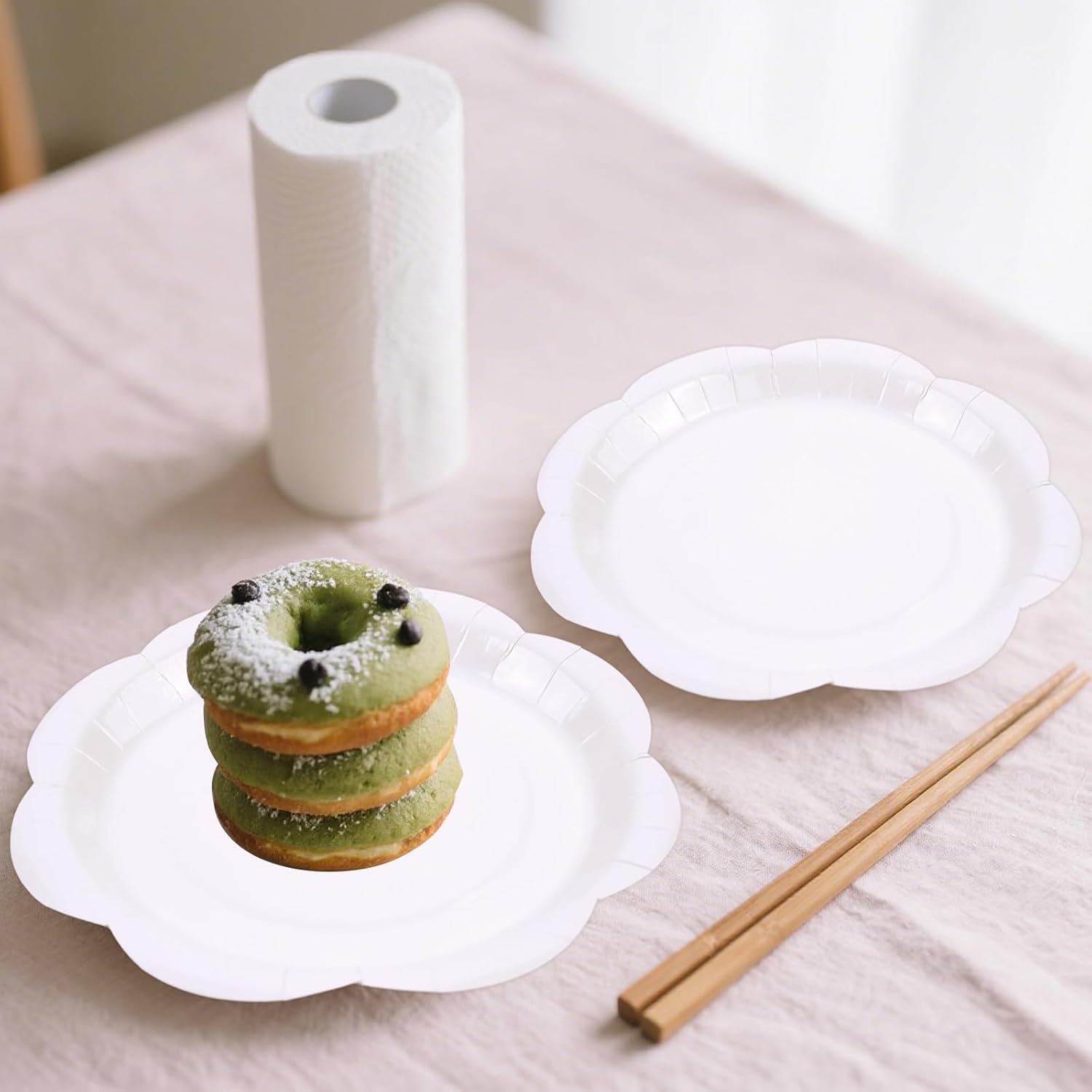 • White Scalloped Paper Plates Set: This package includes 50 x 7-inch white dessert plates, providing ample quantities for parties, gatherings, or daily use, ensuring everyone has their own stylish plate.