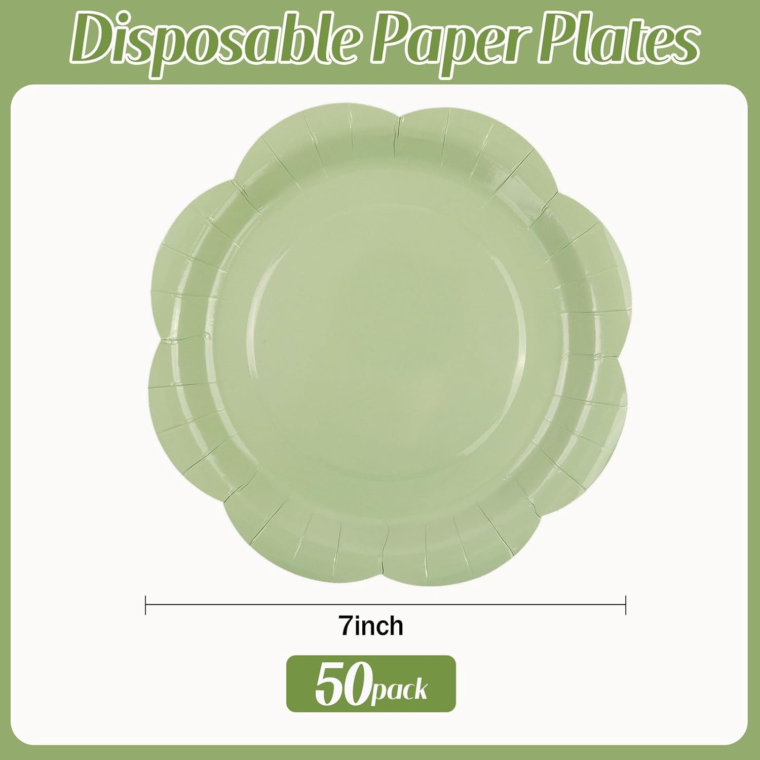 • Sage Green Scalloped Paper Plates Set: This package includes 50 x 7-inch green dessert plates, providing ample quantities for parties, gatherings, or daily use, ensuring everyone has their own stylish plate.