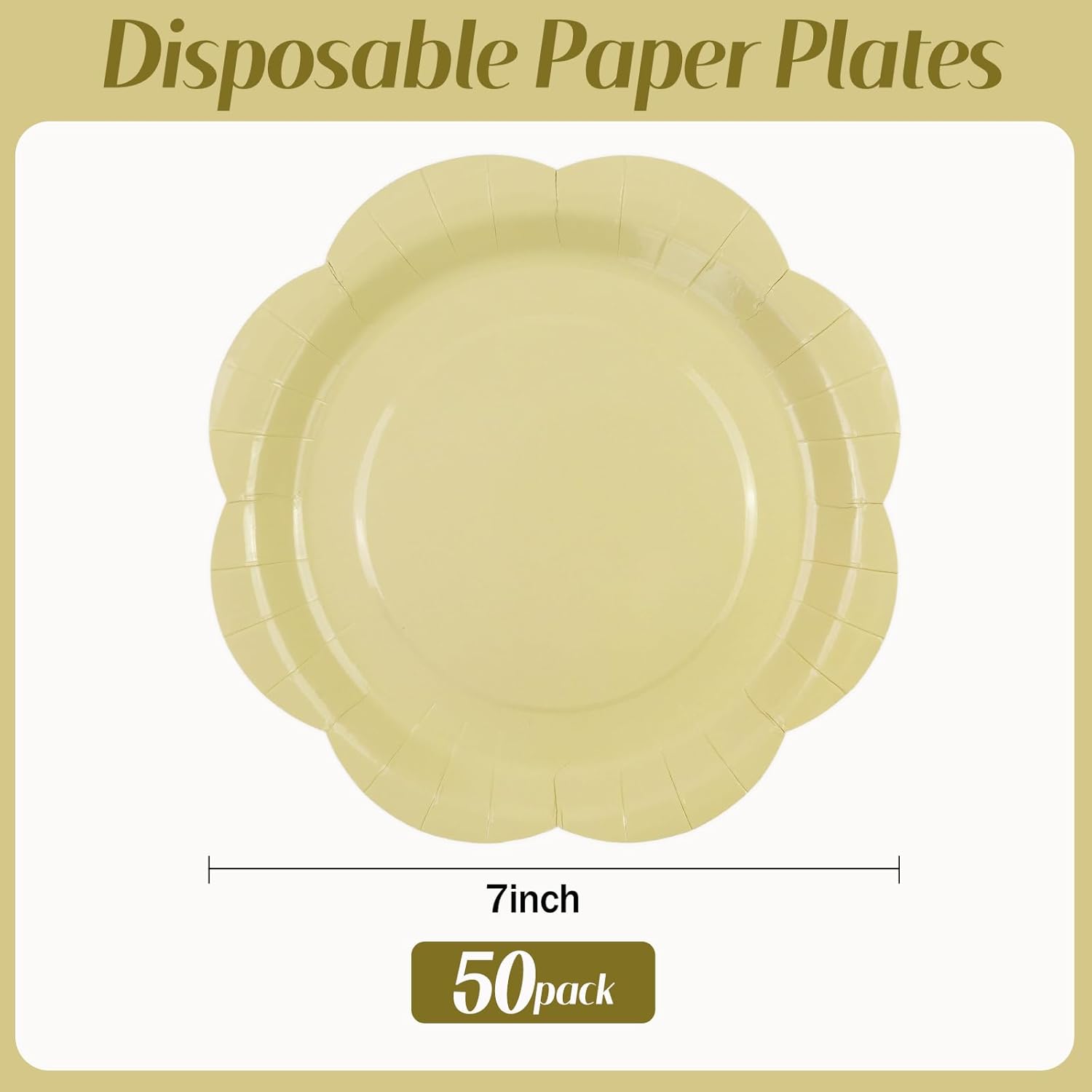 • Yellow Scalloped Paper Plates Set: This package includes 50 x 7-inch yellow dessert plates, providing ample quantities for parties, gatherings, or daily use, ensuring everyone has their own stylish plate.