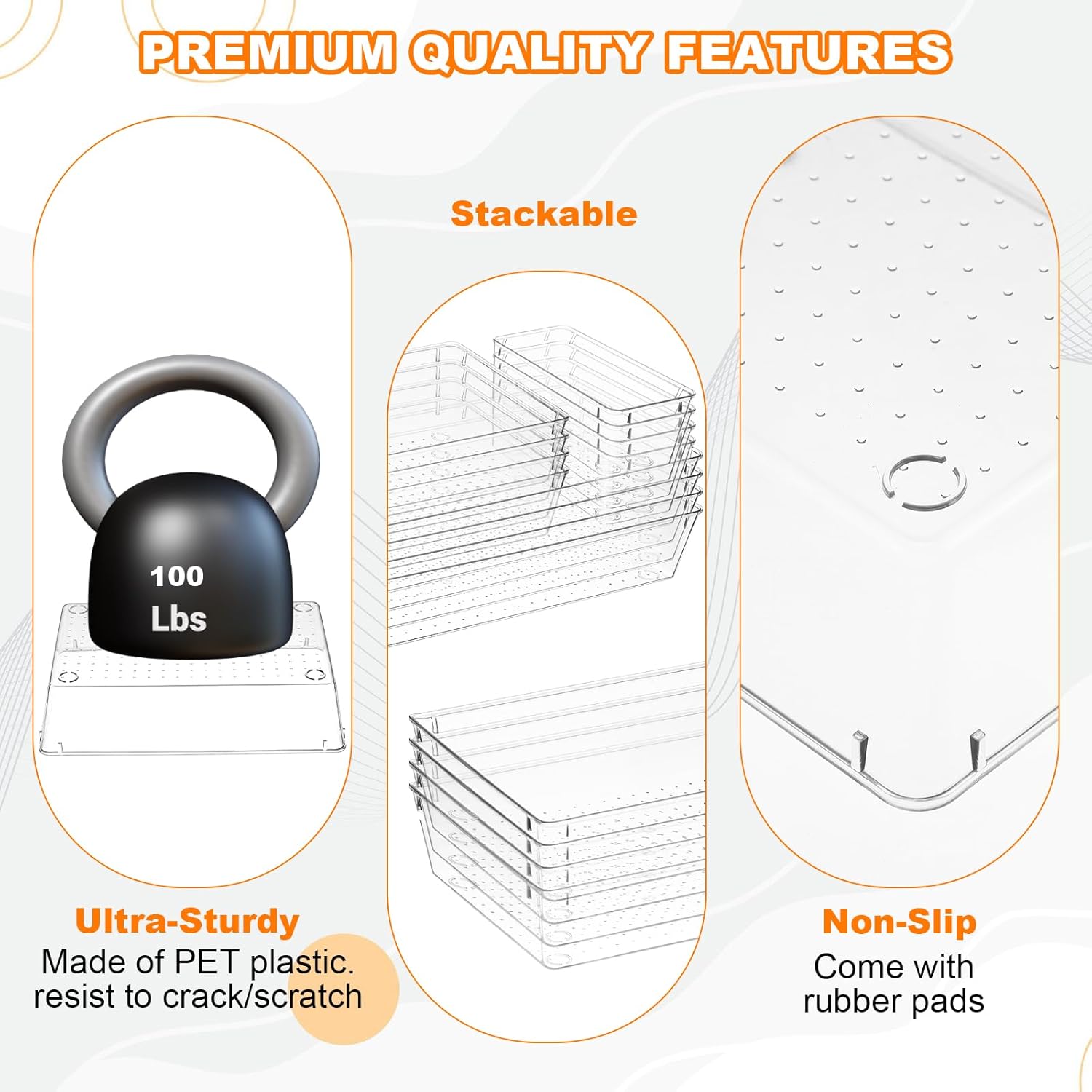 • 【Quantity and Size】There are 12pcs clear drawer organizers in total. The size of storage trays for organizing is 30.5×15×5cm/12×6×2inch、22.8×15×5.5cm/9×6×2inch、15.1×7.5×5.5cm/6×3×2inch,4pcs per size. The capacity is enough to hold a variety of items. You can choose the appropriate number of kitchen drawer organizers to use in combination