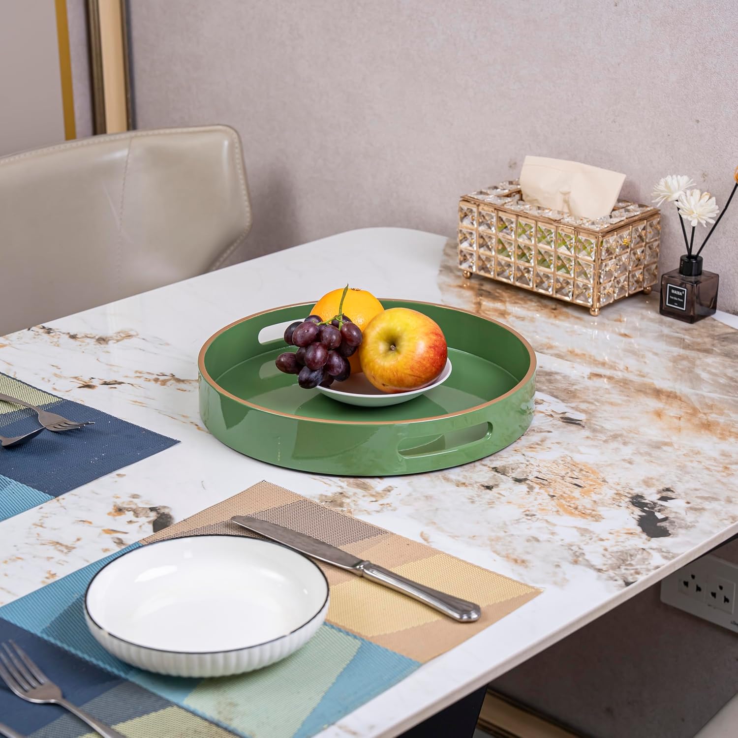 PEMAR 12.6" Round Lacquer Serving Tray with Insert Handle Decorative Basket Tray for Breakfast, Dinner, Coffee Table Decor (Green)