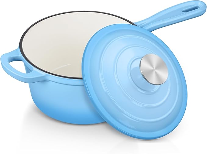 • DURABILITY & SAFE, cast iron sauce pan is made of cast iron core and 3 layers of non-stick enamel coating inside and outside, creating a non-stick and crack-resistant interior to ensure that the enamel doesn't peel off and lasts a long time
