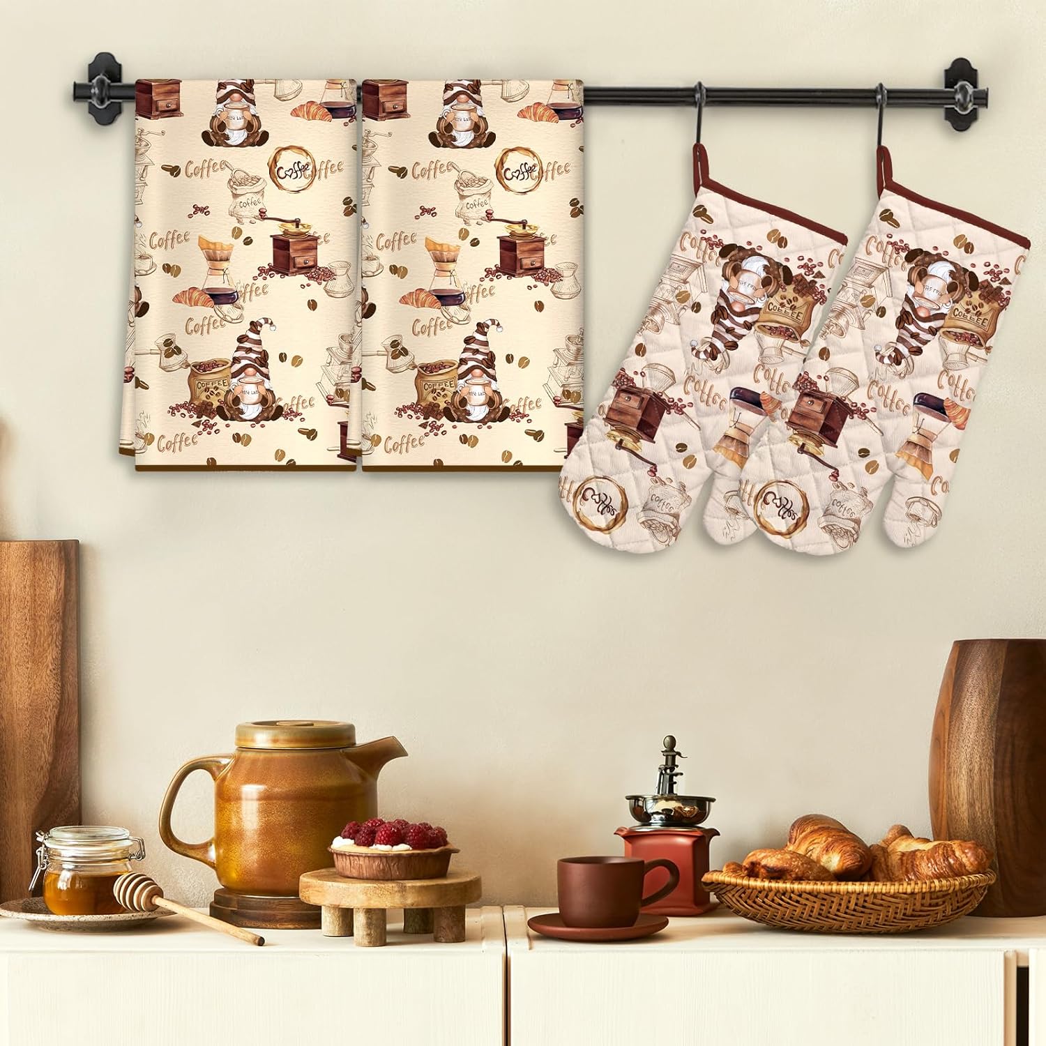 Vintage Coffee Kitchen Towels and Oven Mitts Set 4Pcs, Soft Absorbent Dish Cloth Heat Resistant Oven Gloves for Cooking Baking Kitchen Decoration, Gifts for Her