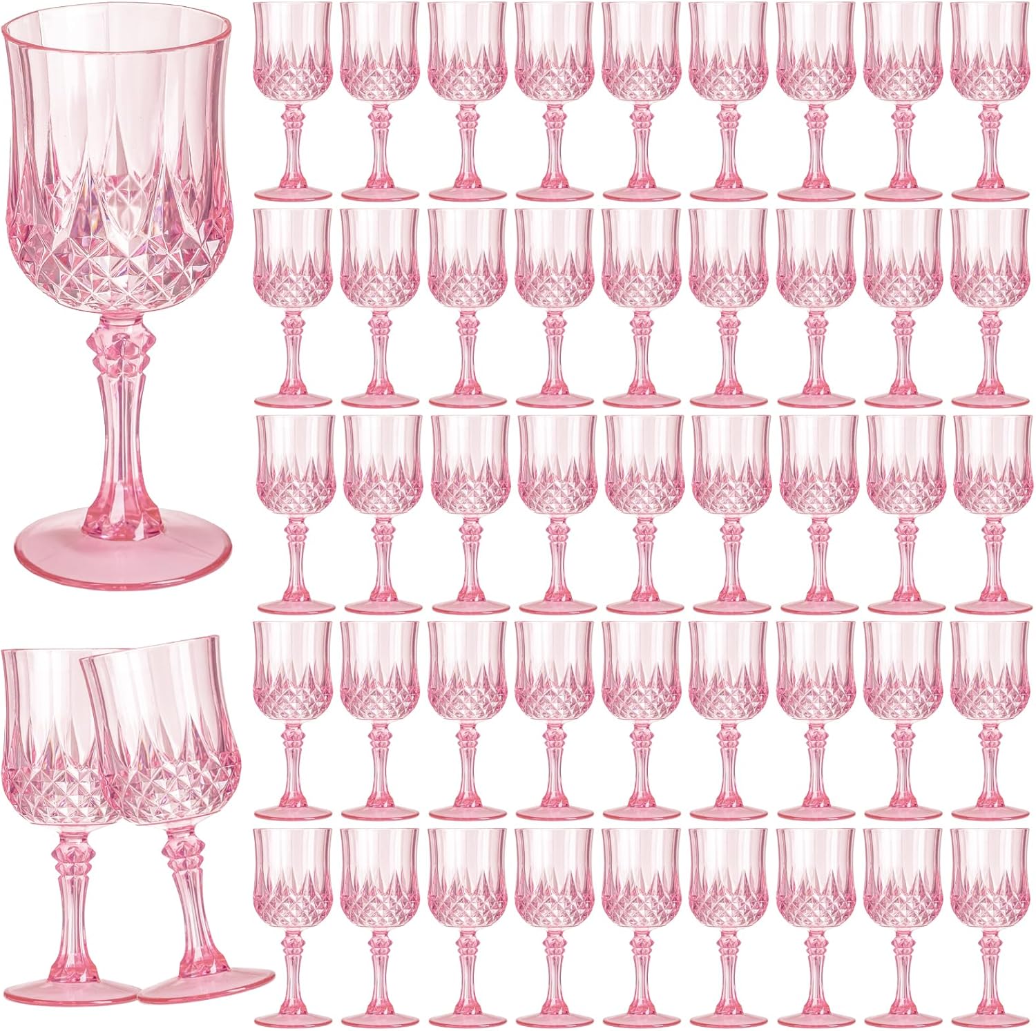 7OZ Plastic Wine Glasses, 48Pcs Pink Reusable Drinking Cups Vintage Champagne Flutes, Plastic Crystal Water Goblets for Parties Stemmed Shatterproof Drinking Glasses for Wedding, Toasting Party