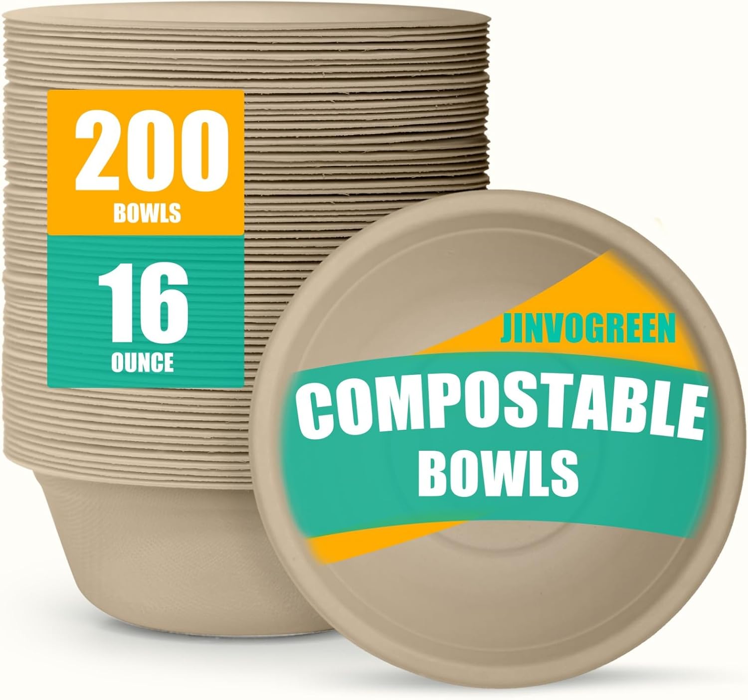 200 Count 16 oz Paper Bowls, Disposable Compostable Bowls, Heavy Duty Biodegradable Sugarcane Bagasse Bowl for Breakfast, Salad, Fruits, Desserts, Natural