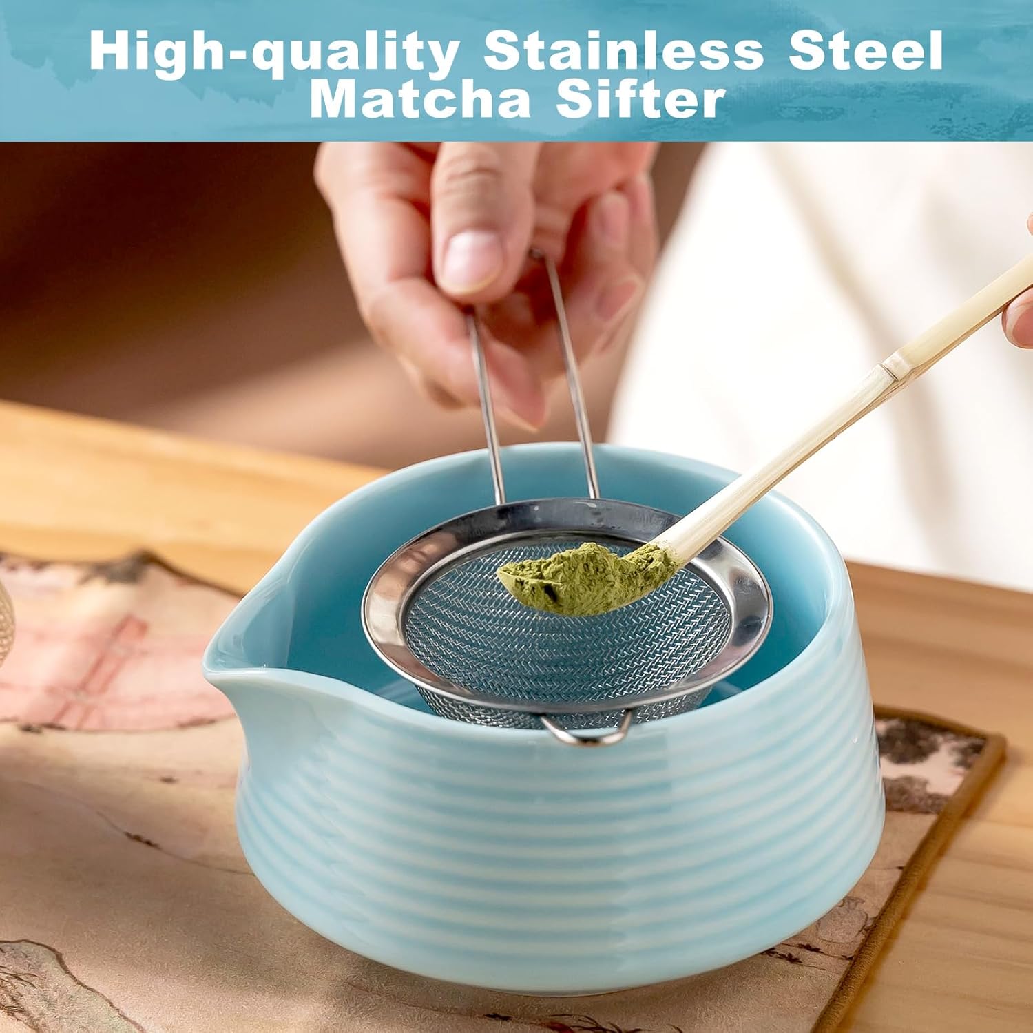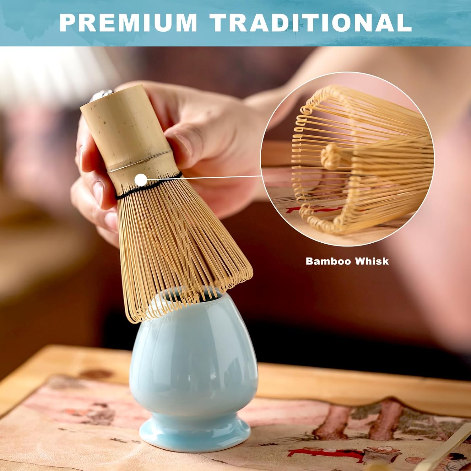 Matcha Whisk Set,Includes Ceramic Matcha Bowl, Bamboo Matcha Whisk and Holder, Bamboo Scoop and Spoon, Scoop Rest, Sifter and Tea Towel,Traditional Japanese Matcha Tea Ceremony Set Gift(Blue)