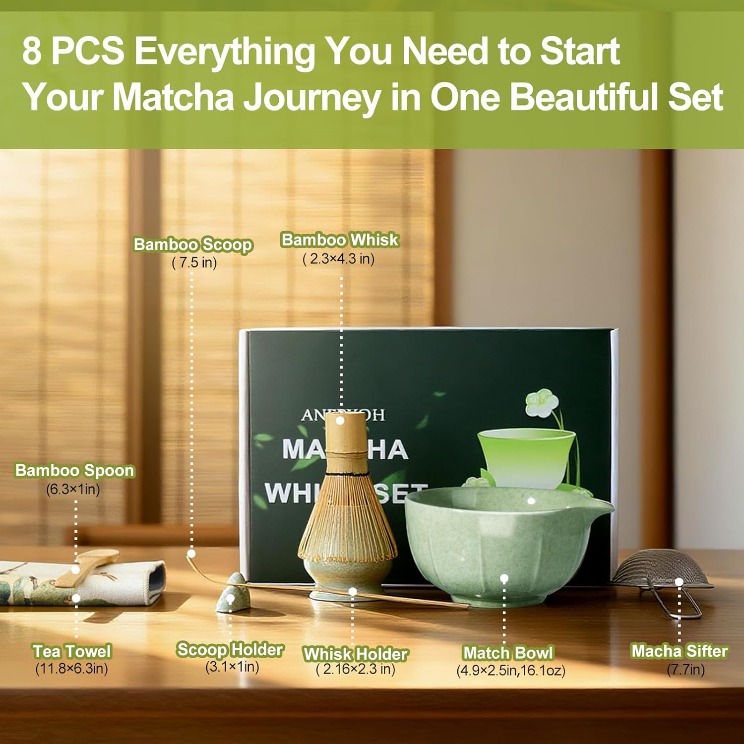 • Complete & Convenient 8-Piece Matcha Kit Set: The matcha making kit everything You Need to Start Your Matcha Journey in One Beautiful Set, Includes: 1×matcha bowl(chawan)16Oz, 1×whisk holder(chasen), 1×ceramic scoop holde, 1×bamboo matcha whisk, 1×bamboo scoop (chashaku), 1×bamboo spoon, 1×cotton tea cloth (chakin), 1×matcha stainless steel sifter, Each item is meticulously crafted to help you create the perfect cup of matcha. optimal for both enthusiasts and newcomers to the world of matcha tea.