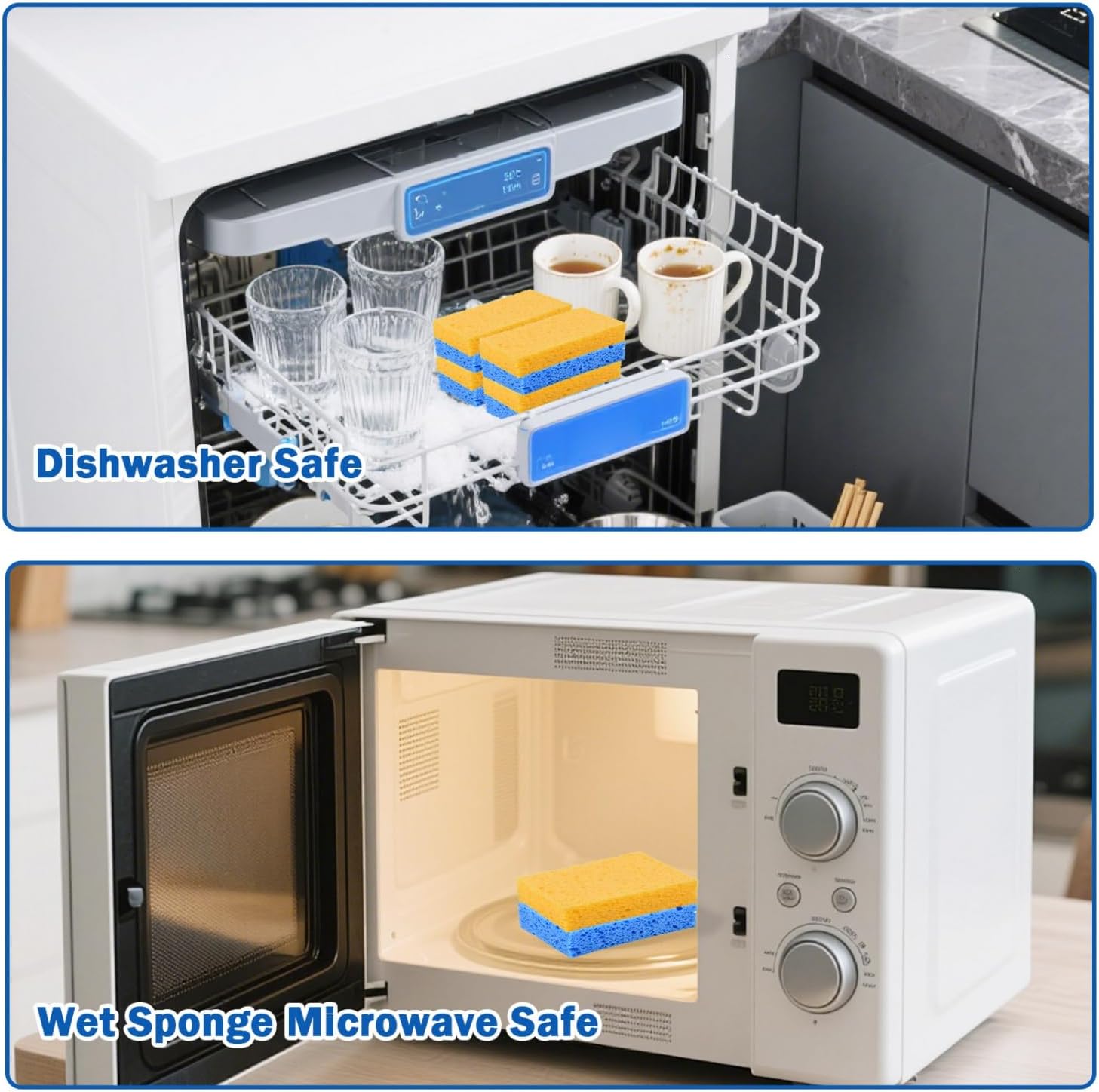 • Scratch-Free: The yellow and blue sponges for cleaning become very soft in the water and will not scratch any material or cutlery