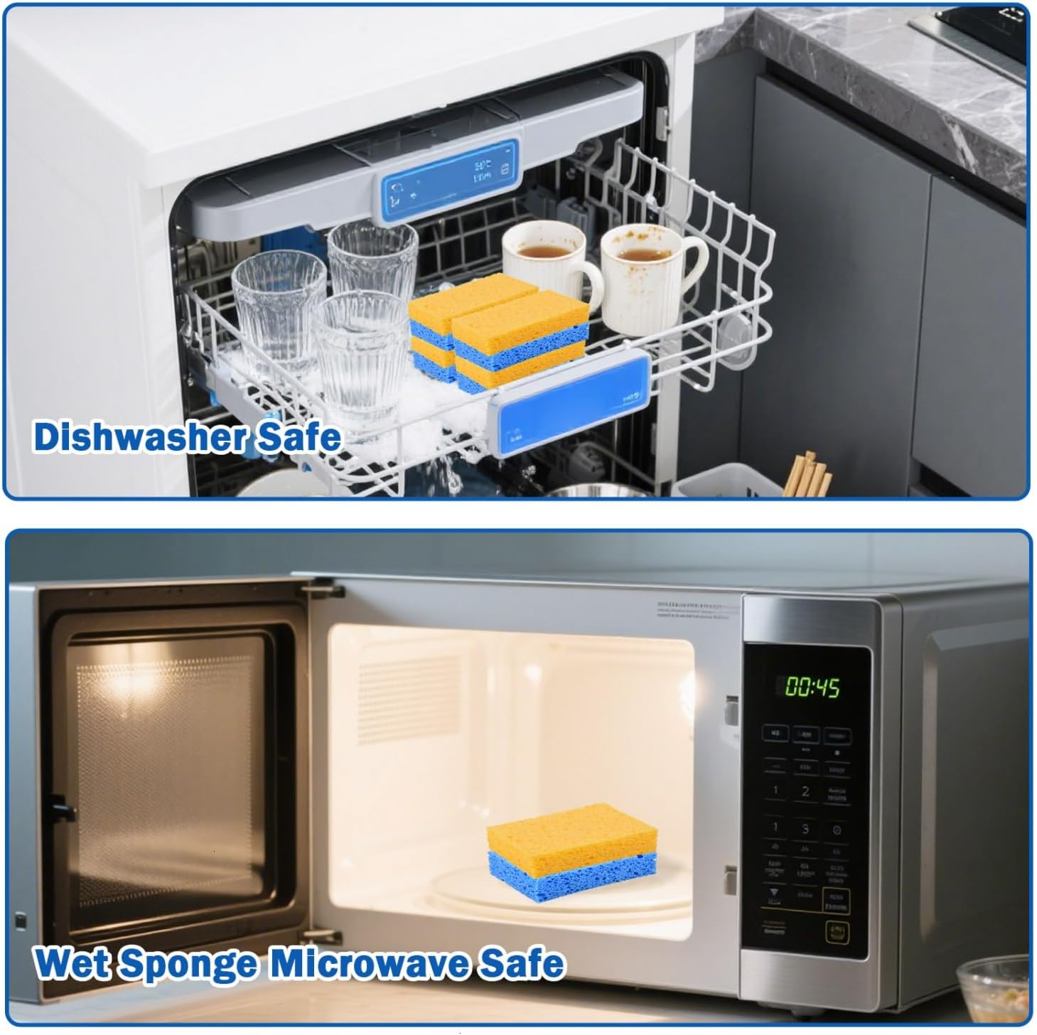 • Scratch-Free: The yellow and blue sponges for cleaning become very soft in the water and will not scratch any material or cutlery