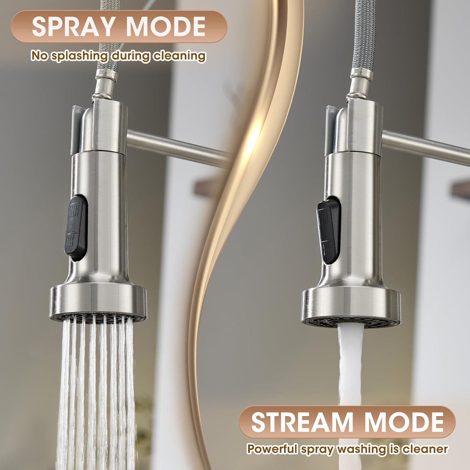 • DUAL WATER MODES - SOEBIZ faucet for kitchen sink offers two modes (STREAM & SPRAY) and features an ergonomic single handle spring design. The commercial kitchen faucet can be rotated 360° and cover the entire sink when in use, which is more convenient and flexibility