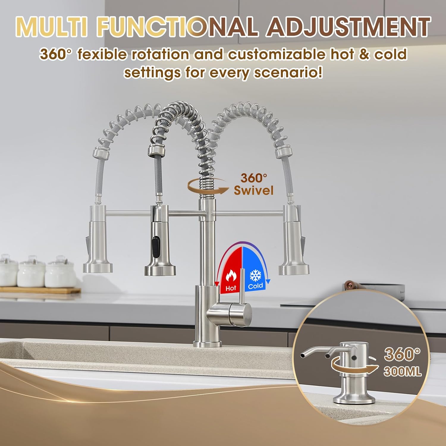 Kitchen Faucet with Sprayer Soap Dispenser Brushed Nickel Stainless Steel Single Handle 1 or 3 Hole Dual Function Spring Commercial Kitchen Faucets for Farmhouse Camper Laundry Rv Bar