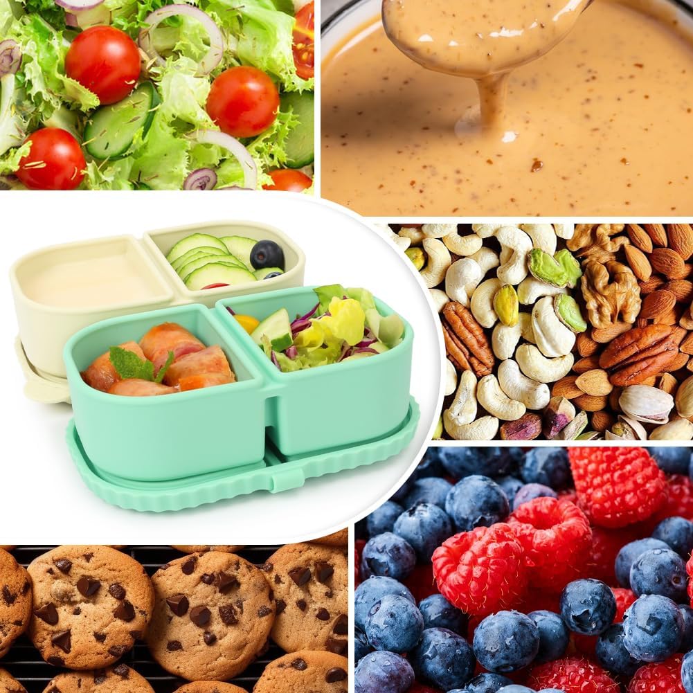 • Double Compartments for Smart Separation: Each silicone snack container features two compartments to keep food items separate and fresh. Great for pairing fruits and yogurt, veggies and dip, or any snack combo withoutmixing flavors.
