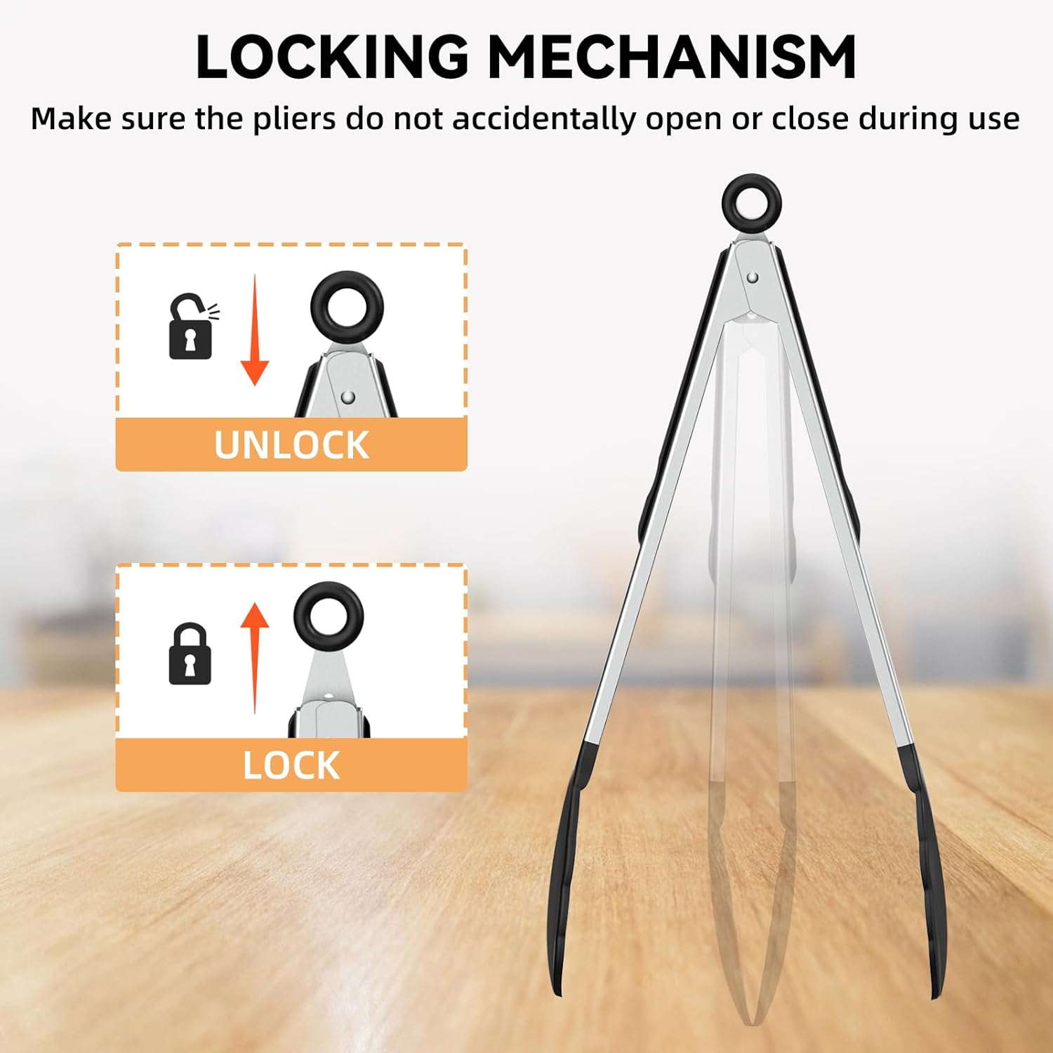 • EASY TO STORE: Kitchen tongs have a locking mechanism to ensure that the tongs will not be accidentally opened or closed during use, pull the ring to lock and push to unlock, giving you better control over cooking, and the operation is super simple. Hang them with the hanging ring after use or lock them by pulling the ring and put them in the drawer, saving space.