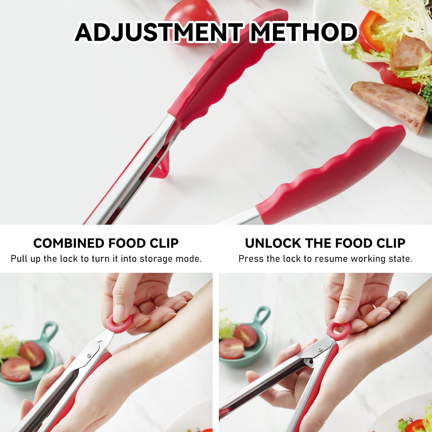 • EASY TO STORE: Kitchen tongs have a locking mechanism to ensure that the tongs will not be accidentally opened or closed during use, pull the ring to lock and push to unlock, giving you better control over cooking, and the operation is super simple. Hang them with the hanging ring after use or lock them by pulling the ring and put them in the drawer, saving space.