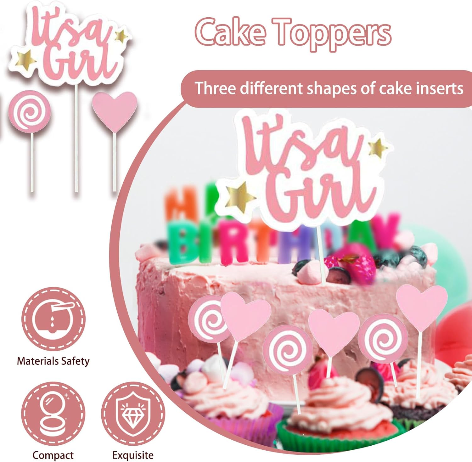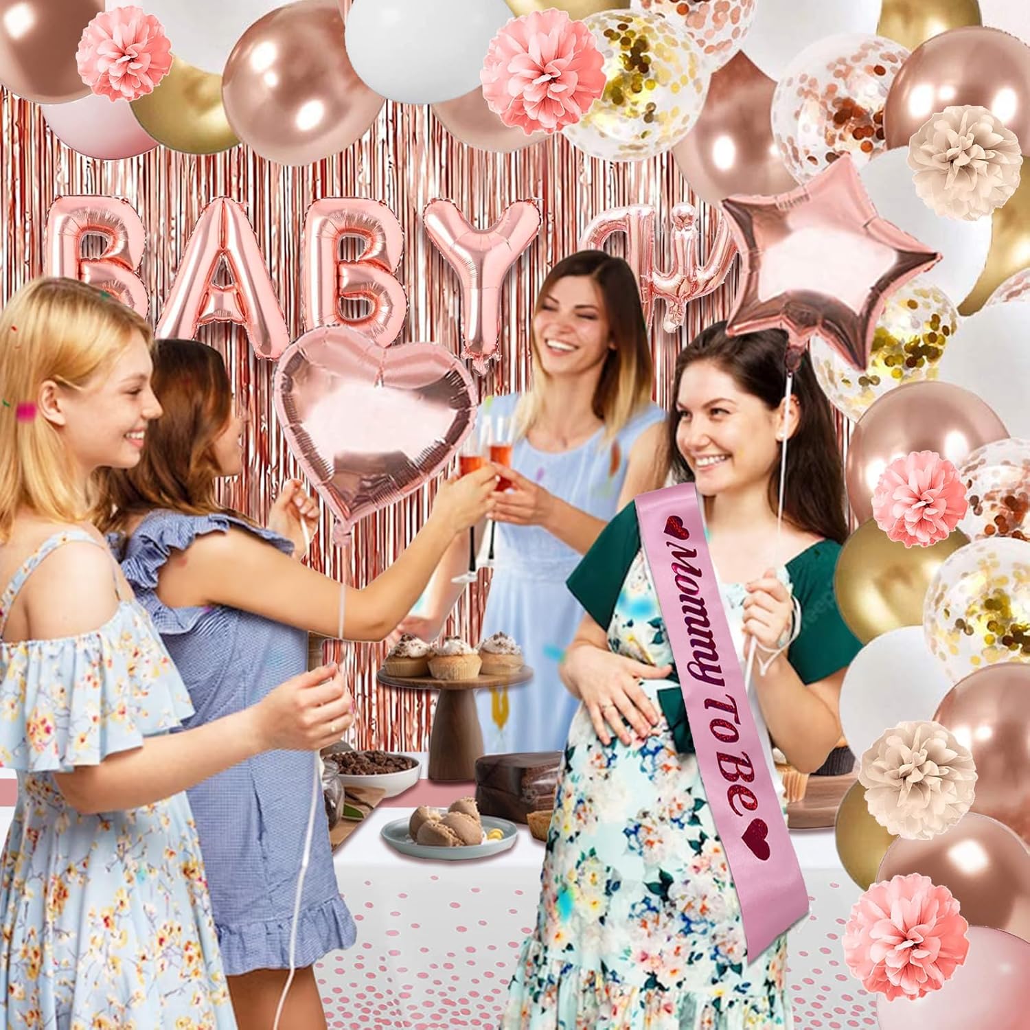 • [All-in-One Party Decoration Set] - This 301-piece baby shower decorations for girl set includes 50 x 9" plates, 50 x 7" plates, 50 x 9 oz cups, 50 x straws, 1 x rose gold tablecloths, 1 x rose gold table flag, 2 x rose gold fringe curtain, 8 x paper flowers, 1 x Big Cake Topper, 10 x heart cake toppers, 10 x lollipop cake toppers, 1 x "Mommy to be" sash, 4 x foil balloons (2 x star, 2 x heart), 50 x latex balloons, 1 x tassel flag, 1 x "BABY girl" banner, 2 x ribbon, 1 x confetti, 1 x arch strip.
