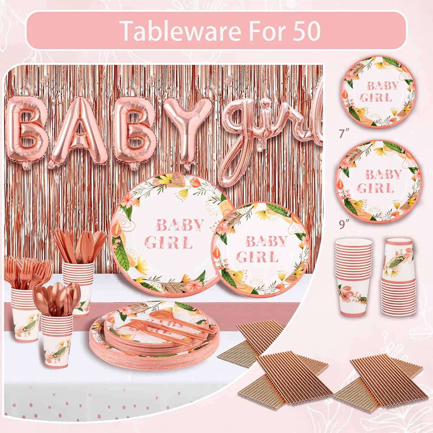 301Pcs Baby Shower Decorations For Girl, Girl Baby Shower Decorations Kits - Disposable Dinnerware Set With Pink Rose Gold Floral (50 Guest), "BABY girl" Banner, Balloon, Sash, Cake Topper