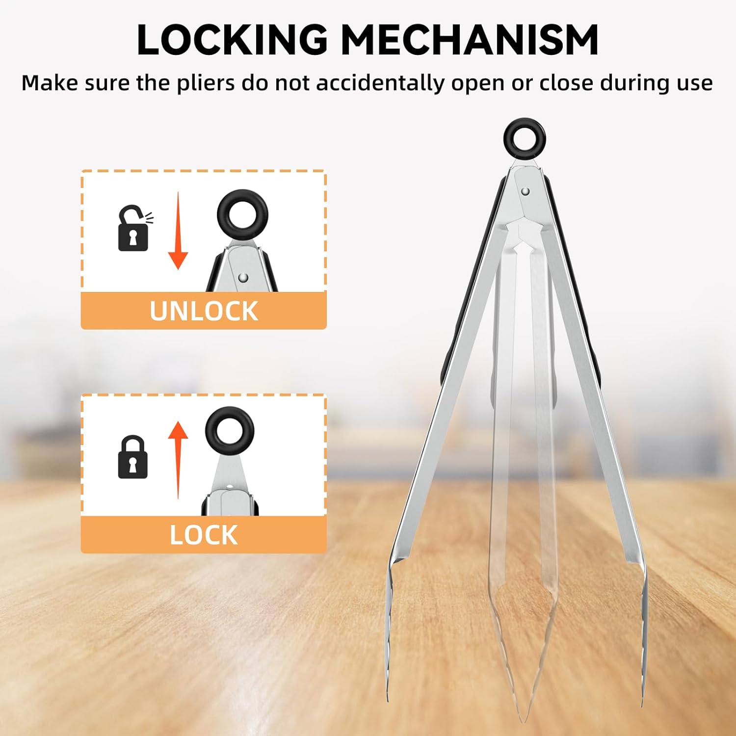 • EASY TO STORE: Kitchen tongs have a locking mechanism to ensure that the tongs will not be accidentally opened or closed during use, pull the ring to lock and push to unlock, giving you better control over cooking, and the operation is super simple. Hang them with the hanging ring after use or lock them by pulling the ring and put them in the drawer, saving space.