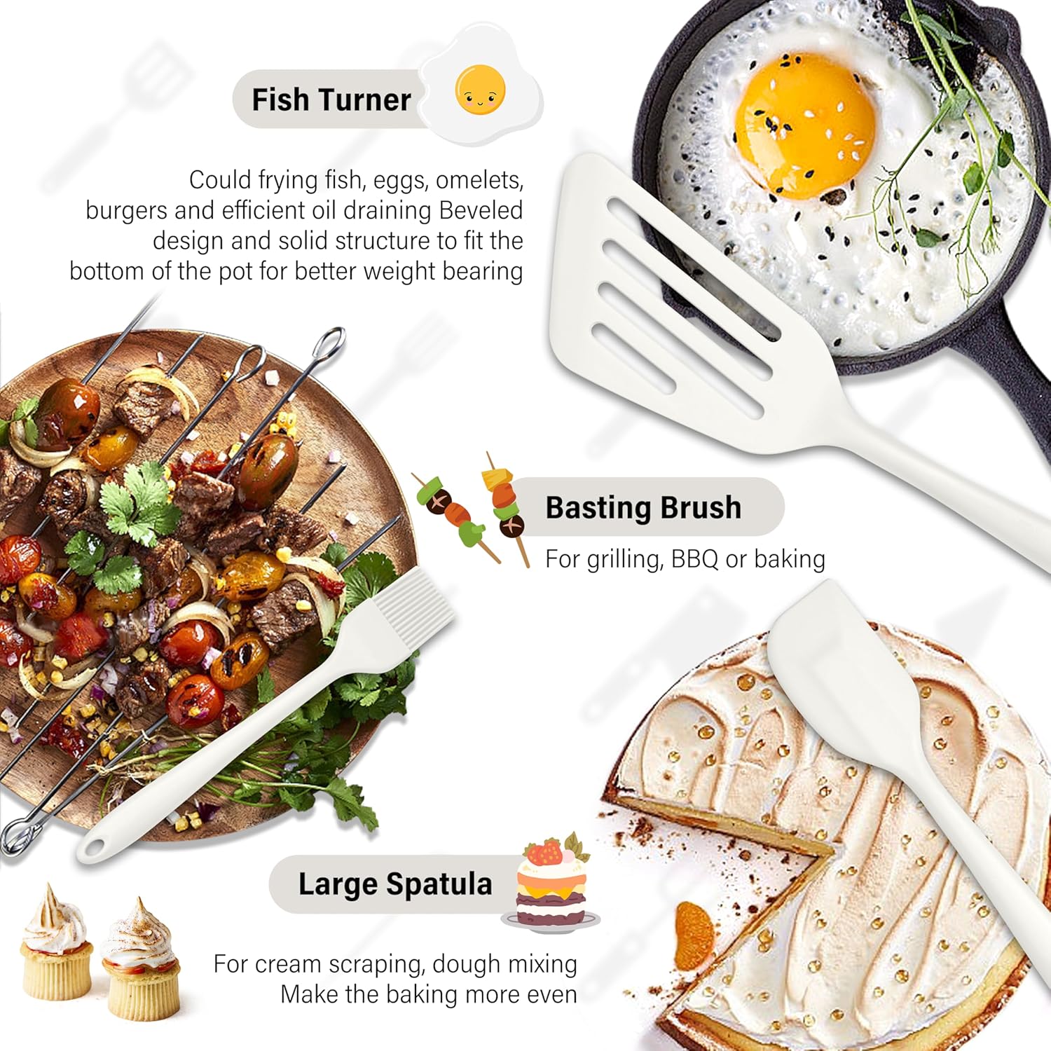 • HEAT-RESISTANT AND NON-SCRATCH: This kitchen utensils set with soft silicone head, strong inner core withstands high temperatures (up to 450°F), not easy to bend, melt, or wrap when cooking, Anti-scratch to protect the surface of non-stick pans and cookware, extend the life of all your kitchen pots and pans, could meets all you kitchen cooking demands for stirring, baking, frying, boiling, flipping etc