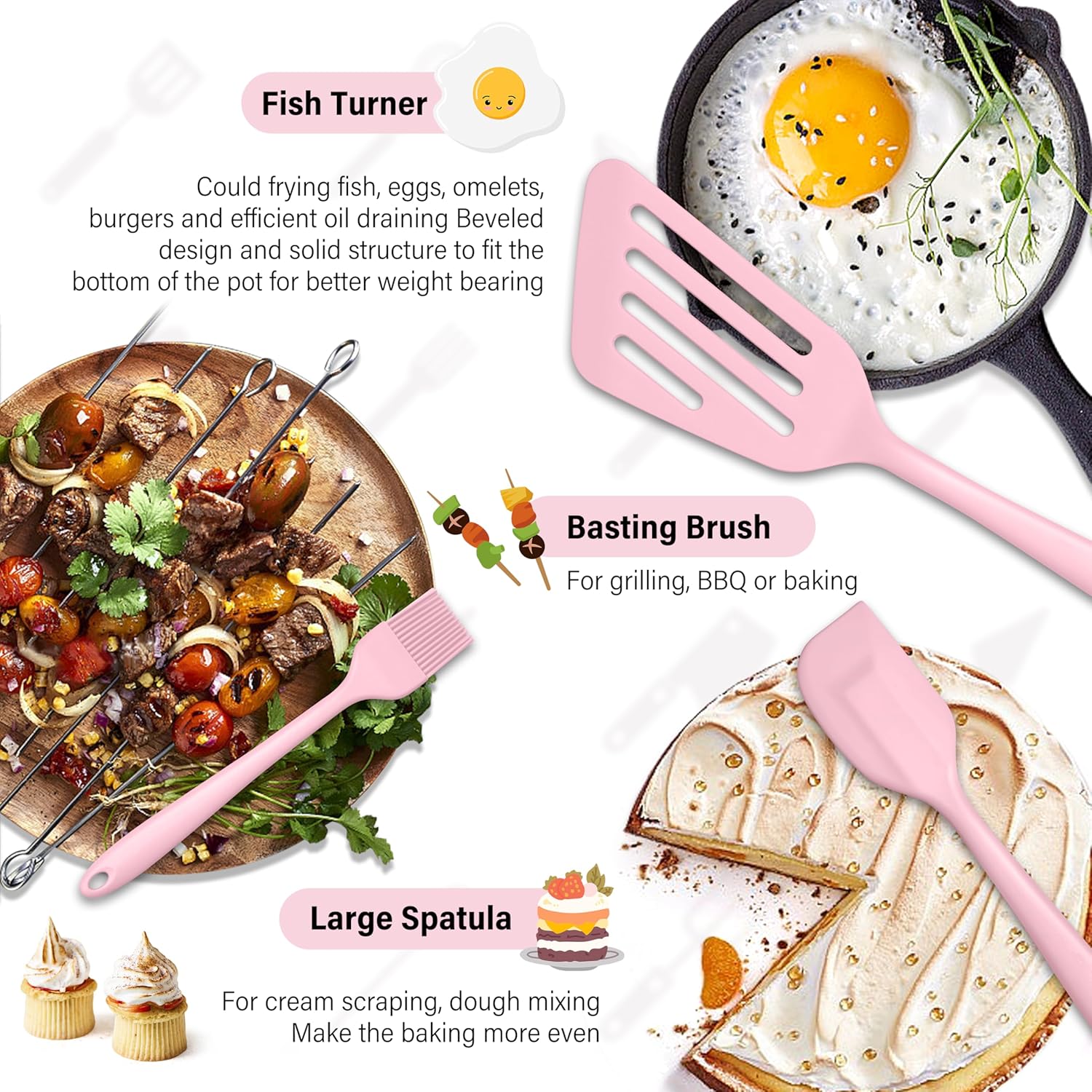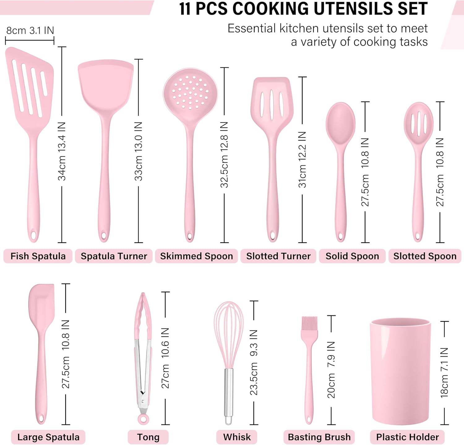 HaWare 11 PCS Silicone Cooking Utensils Set, Heat Resistant Kitchen Utensils with Holder, Food-grade Spatula Sets for Nonstick Cookware, Kitchen Tools Gadgets Include Fish Turner, Spoon (Pink)