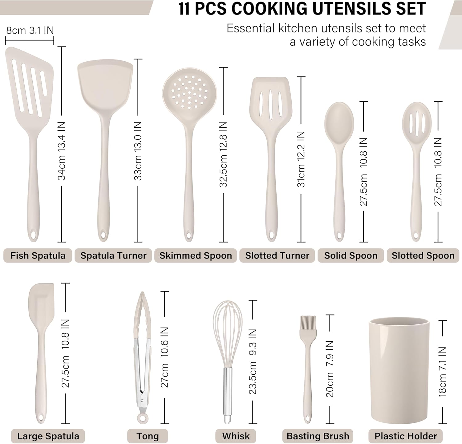 HaWare 11 PCS Silicone Cooking Utensils Set, Heat Resistant Kitchen Utensils with Holder, Food-grade Spatula Sets for Nonstick Cookware, Kitchen Tools Gadgets Include Fish Turner, Spoon (Khaki)