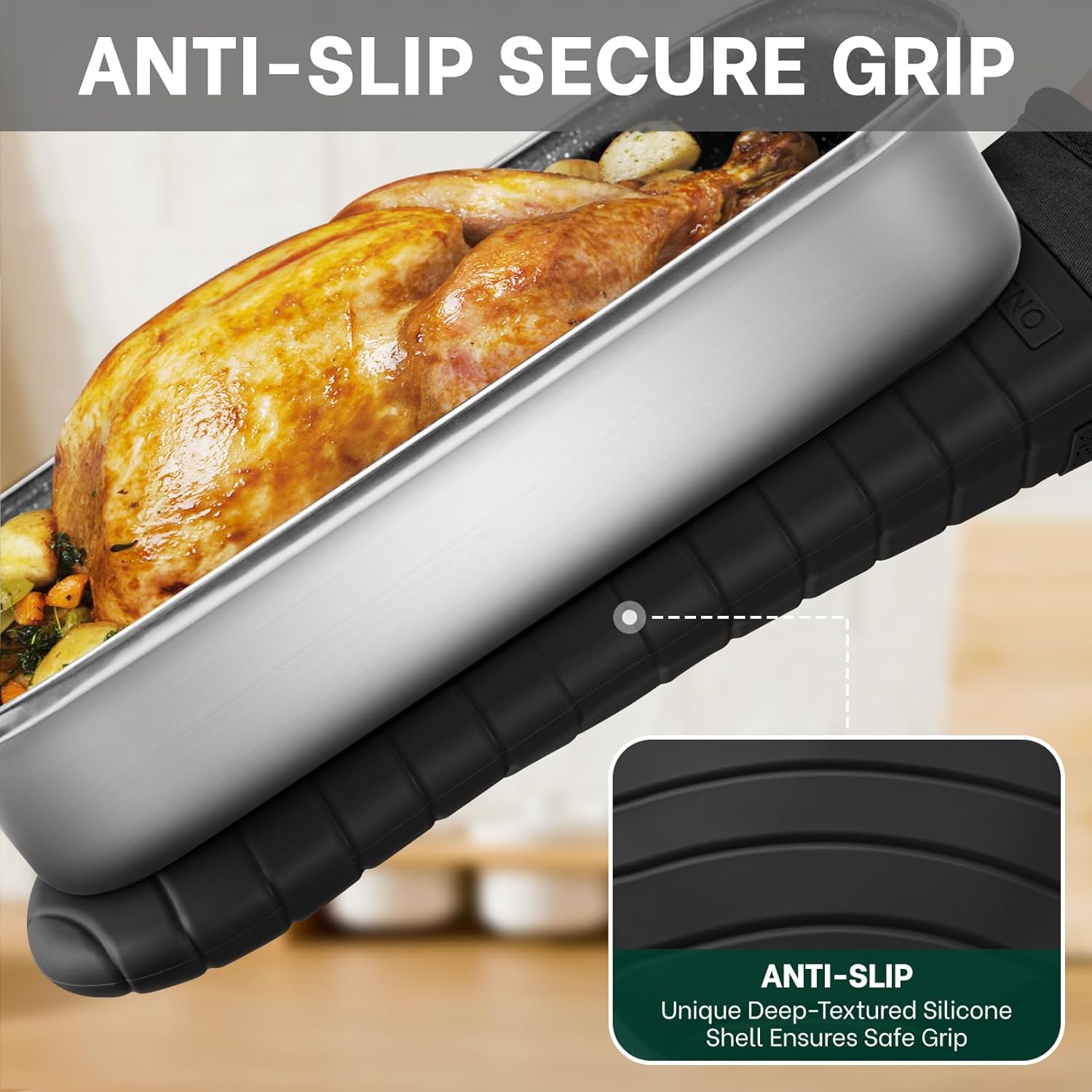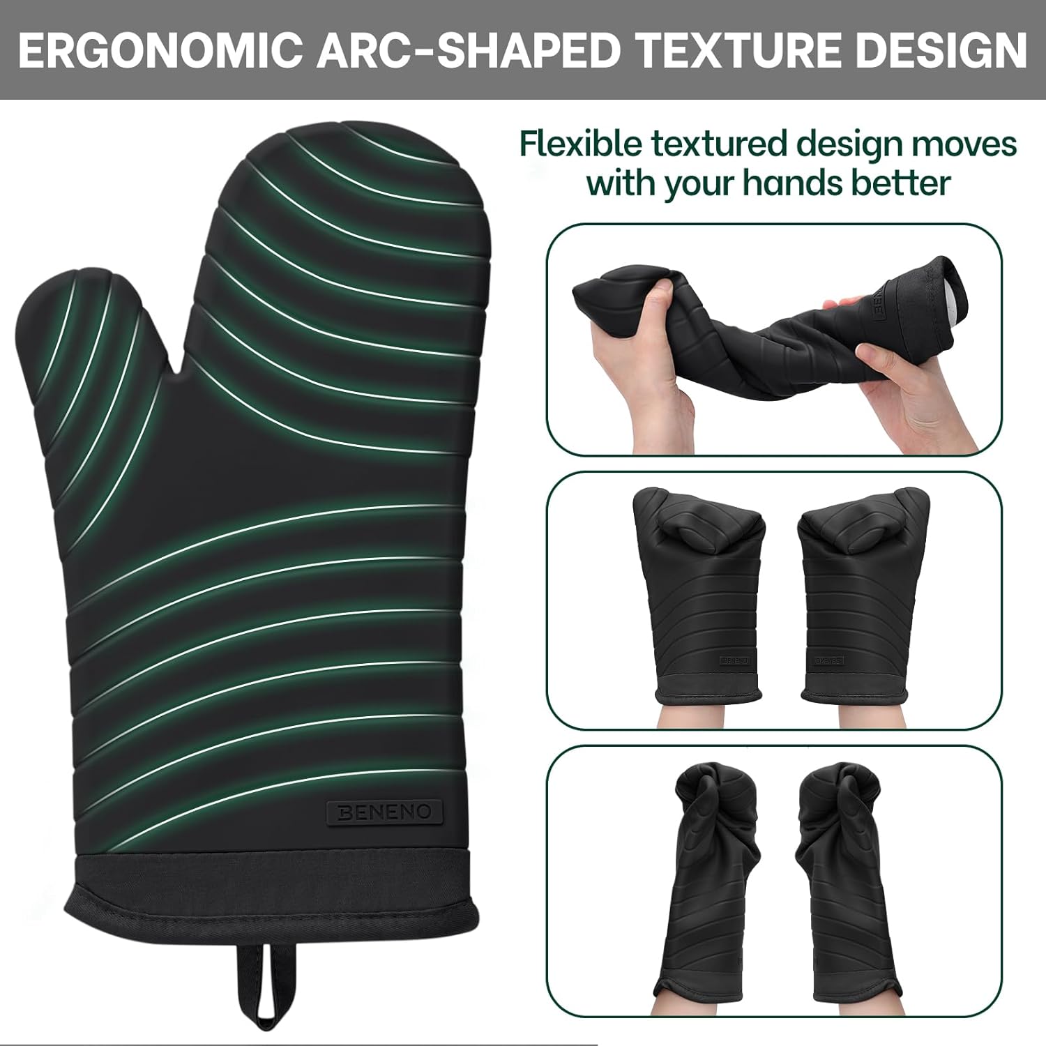 • Non-Slip Flexible Grip: These silicone oven mitts features a deep-textured slip-resistant stripe pattern with a unique ergonomic arc-shaped texture design on the fingers and thumbs, allowing the mitts moves with your hands better, delivering a slip-proof grip and safe control to grab, lift, and maneuver hot oil cooking pans and heavy oven racks