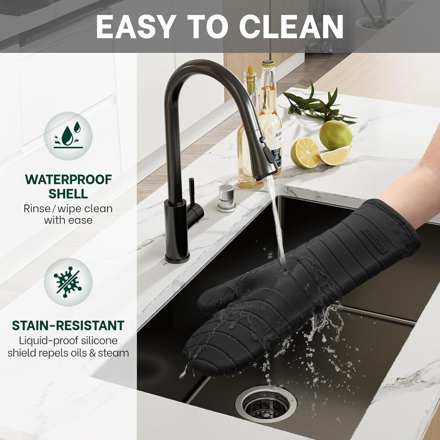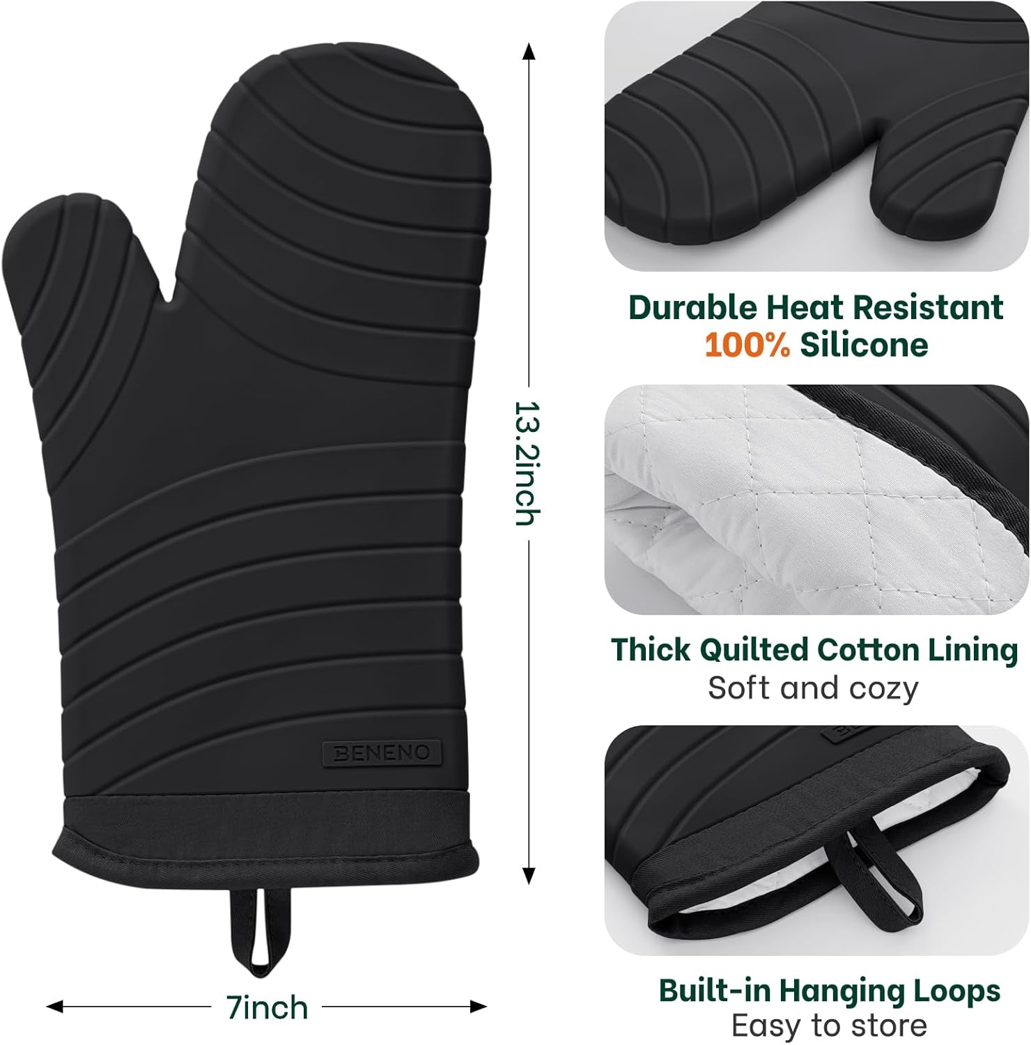 Beneno BPA-Free Silicone Oven Mitts, Heat Resistant Waterproof Oven Mitts with Non-Slip Textured Grip, Comfortable Quilted Lining, Kitchen Pot Holders for Cooking, Baking, Grilling, 7"x13", 2Pcs Black