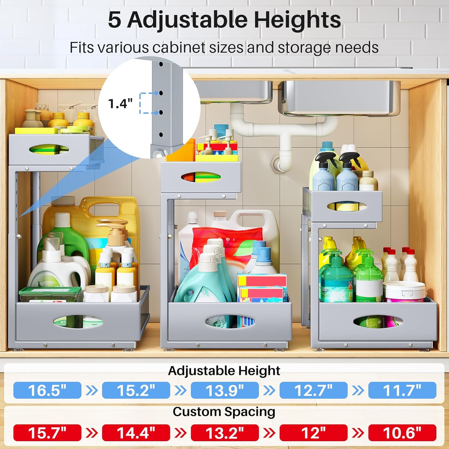 • Extra-Large Storage Space: Designed for maximum storage efficiency, this under sink organizer features a bottom basket size of 16" (depth)x 11""(width) and a top basket size of 15.35"(depth) x 7.5""(width), offering more space than standard under cabinet organizers. Ideal for kitchen storage organization or bathroom organizers and storage. Please check cabinet size before purchasing.