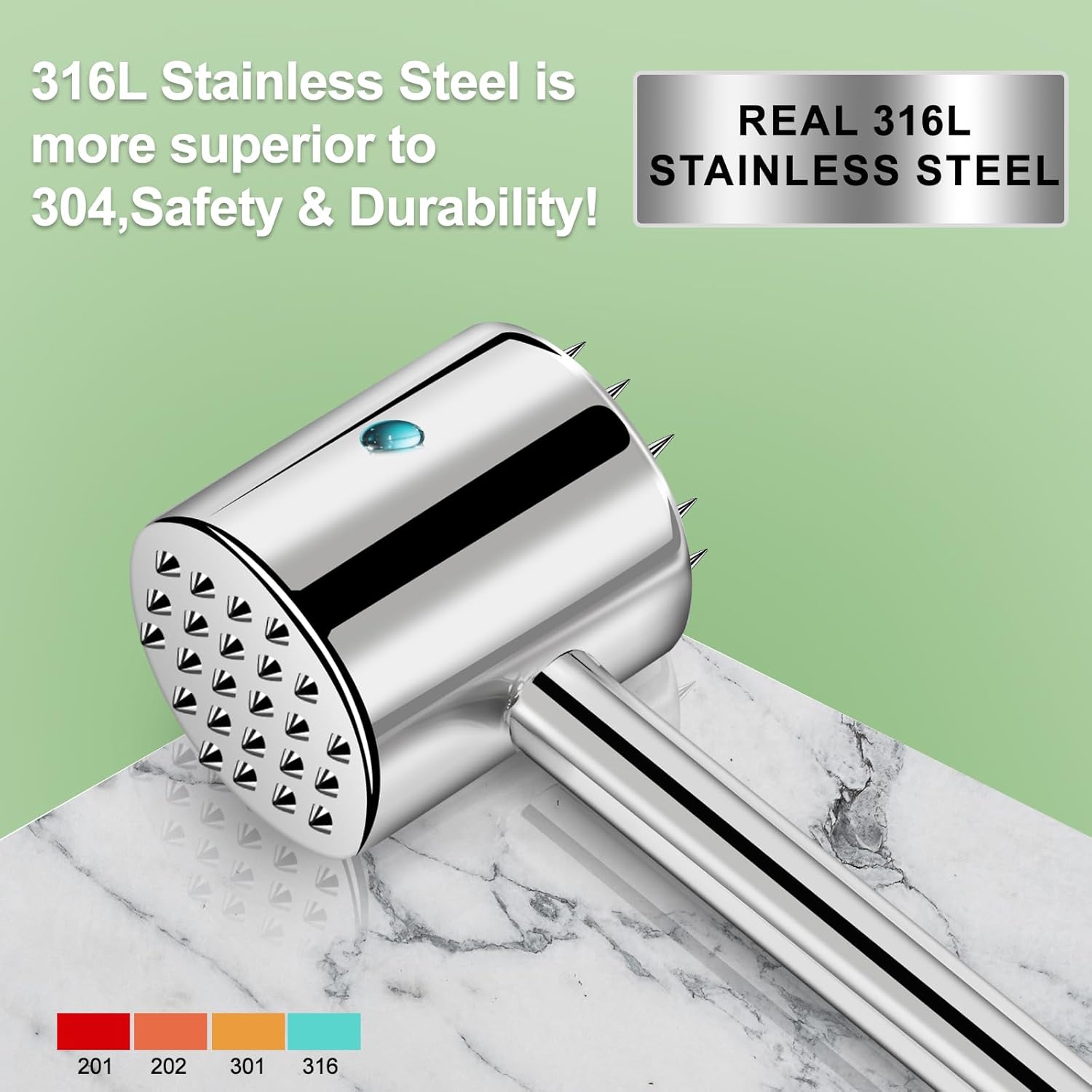 • Food-Grade 100% 316L Stainless Steel:Unlike ordinary 304 stainless steel, our meat mallet is made of medical-grade Genuine 316L stainless steel, which is more corrosion-resistant, rust-proof, and safe for food contact. No harmful substances, even after repeated dishwasher cleaning.