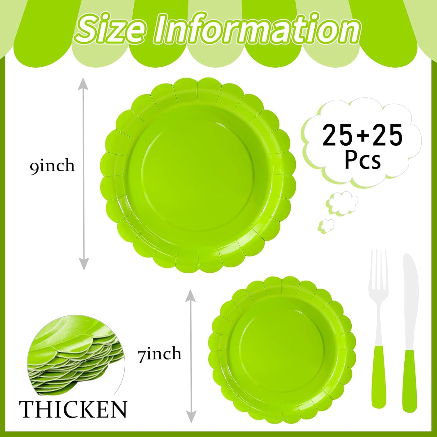 • Lime Green plates: You will receive 25 pcs 7 inch and 25 pcs 9 inch lime green scalloped plates, which are sufficient for both daily dining needs or party needs. The green scalloped dessert plates help to enhance the beauty and make the party more elegant