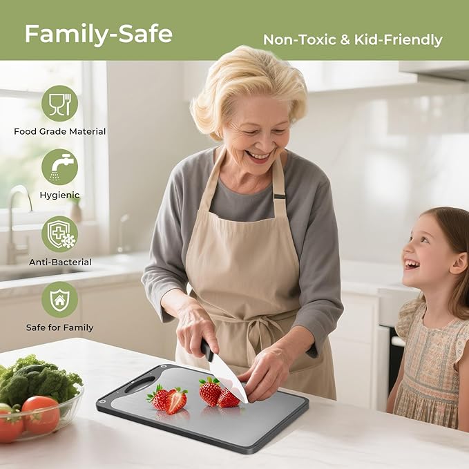• DOUBLE-SIDED DESIGN FOR HYGIENIC FOOD PREP: One side of this titanium cutting board features a sleek Pure Titanium surface, ideal for meats and juicy foods thanks to its non-porous, easy-clean nature, while the other is made of natural wheat straw PP perfect for fruits, veggies, and bread. Keep your kitchen organized and avoid cross-contamination with this smart two-in-one solution
