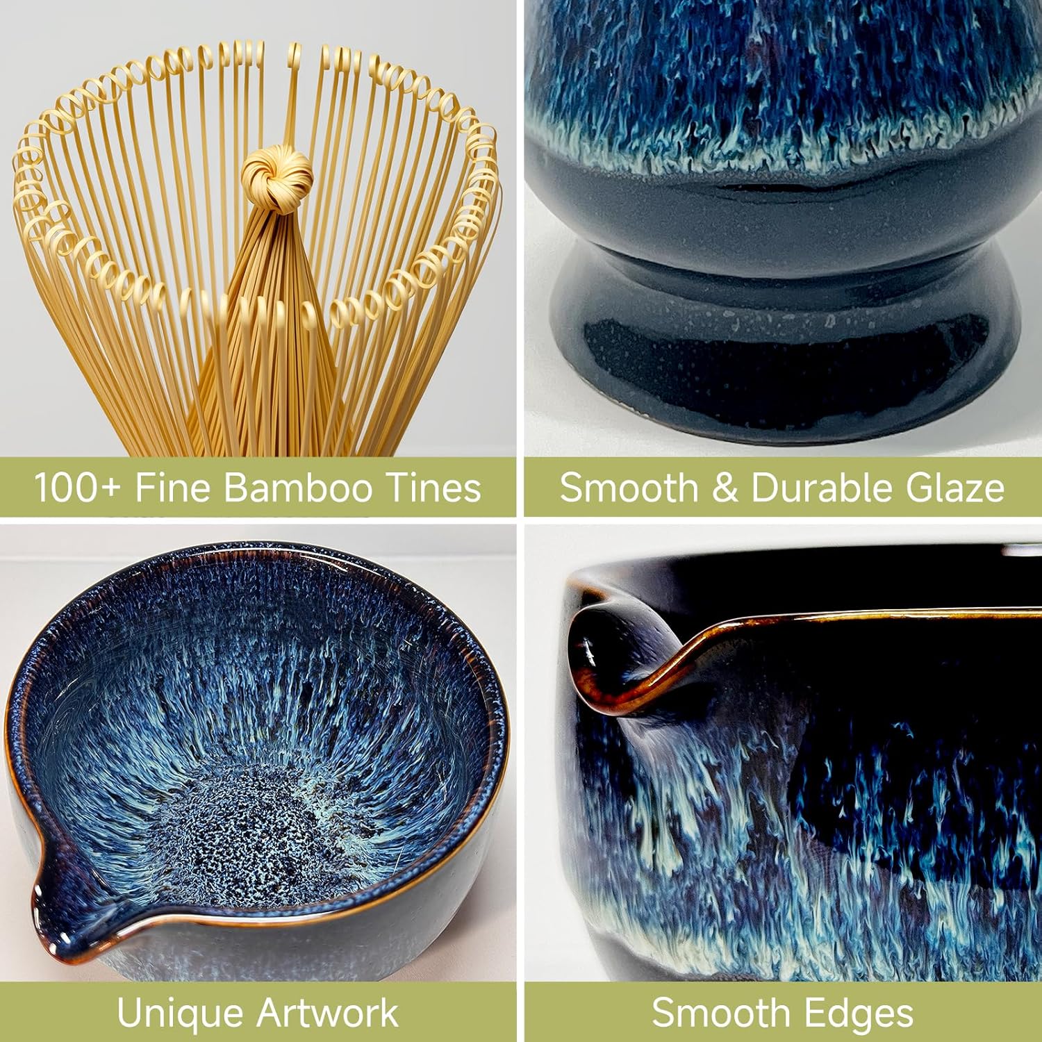 Matcha Whisk Set with Ceramic Bowl - Bamboo Whisk (Chasen), Scoop, Sifter & Holder - Complete Kit for Traditional Matcha Tea - Unique Gifts for Women, Men, Tea Lovers (Luminous-Auric-Sands)