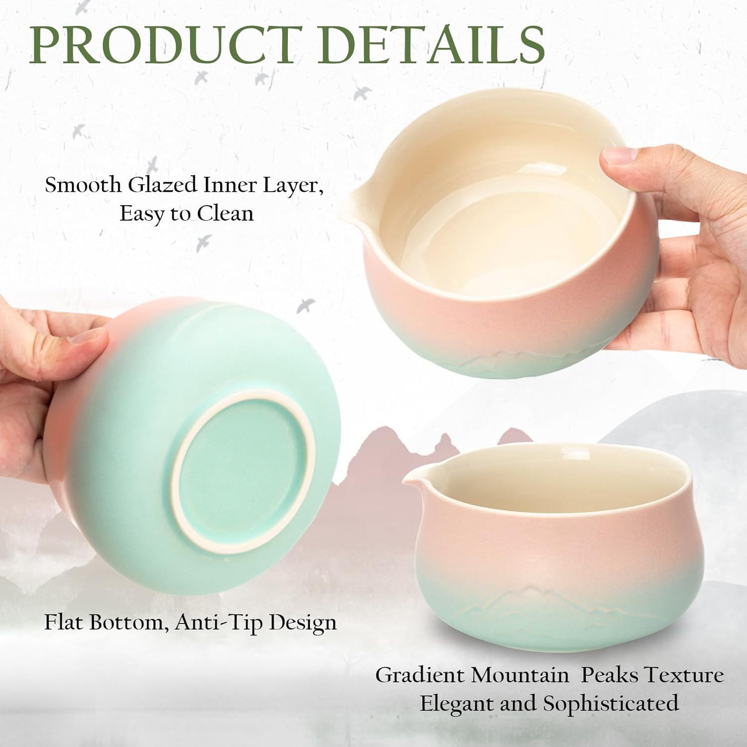 • 【Zen-Inspired Matcha Whisk Set】 Drawing inspiration from ethereal mountain forests, this matcha set features a matcha bowl with a spout finished in a serene pink-to-green gradient. The matcha bowl's surface etched with distant peak motifs that harmonize modern aesthetics with traditional elegance; this artfully crafted ensemble merges practicality with decorative artistry, transforming your matcha preparation into a meditative ritual.
