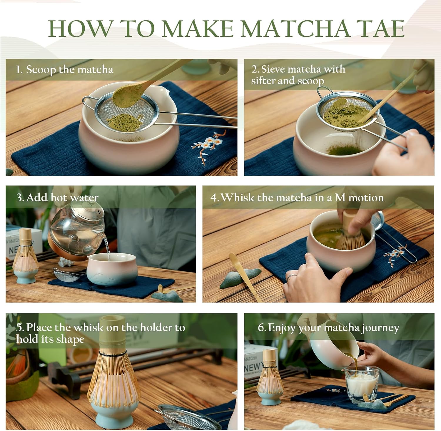 • 【Complete Matcha Making Kit】 This matcha set for matcha enthusiasts includes everything needed to craft authentic matcha: lead-Free Ceramic Bowl*1, Bamboo Whisk*1, Bamboo Scoops*2, Stainless Steel Sifter*1, Scoop Holder*1, Tea Towel*1, Whisk Holder*1—all exquisitely packaged for secure delivery. Featuring detailed brewing instructions printed on the packaging, these meticulously crafted tools empower both matcha starter and connoisseurs to effortlessly prepare perfect matcha tea every time.