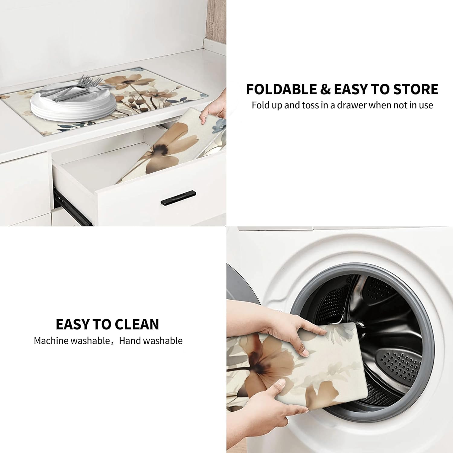 • Multifunctional: You can let it catch drips under a dish drying rack or place dishes directly on the mat to keep counters dry and clean. When placing the mat under small appliances, it protects your kitchen countertop from scratches and scuffs