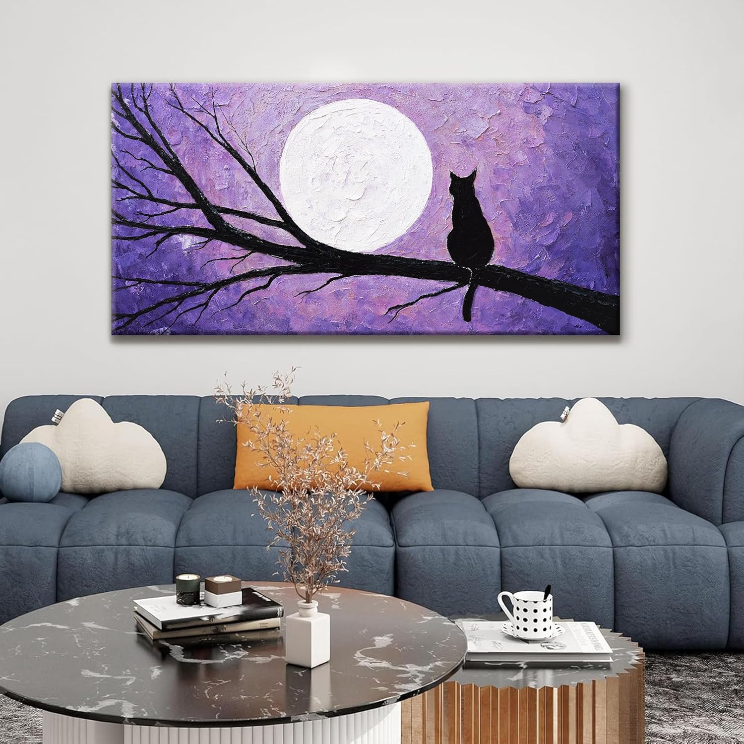 QSQ Cat Wall Art Prints Painting Canvas Art Wall Decor Funny Monet Cat Under The Moonlight Abstract Wall Art Posters Picture For Bedroom Living Room Office Home Decor 24" × 48" Ready To Hang