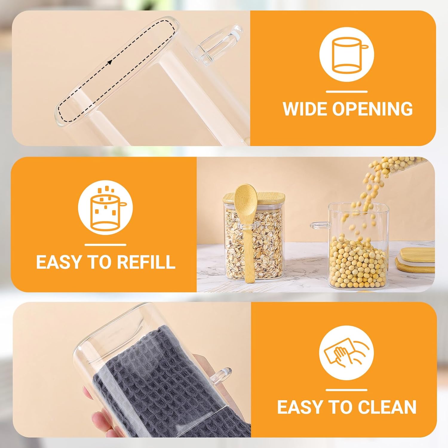 • Glass Jars with Airtight Lid: Each tea container features an airtight bamboo lid with silicone seal bamboo lid, keeps your food fresh and safe from moisture and dust. The matching wooden spoons are convenient for scooping food. In addition, the glass canister is designed with a small handle on the side, allowing you to conveniently place the spoons, keeping everything organized and easy to access.