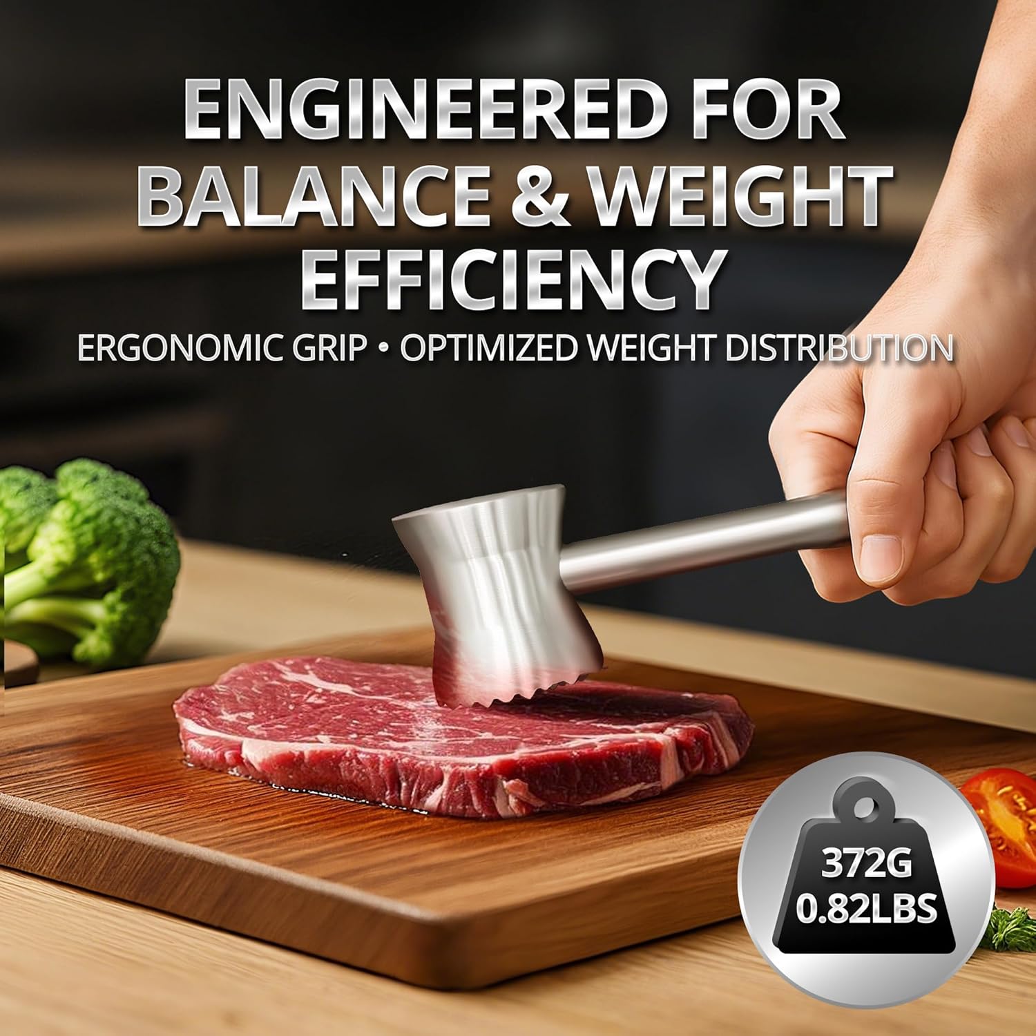 • Efficient Tenderizing with Textured Surface – The hammer side features sharp pyramid-shaped ridges that break down tough muscle fibers, helping meat cook evenly and absorb marinades quickly.