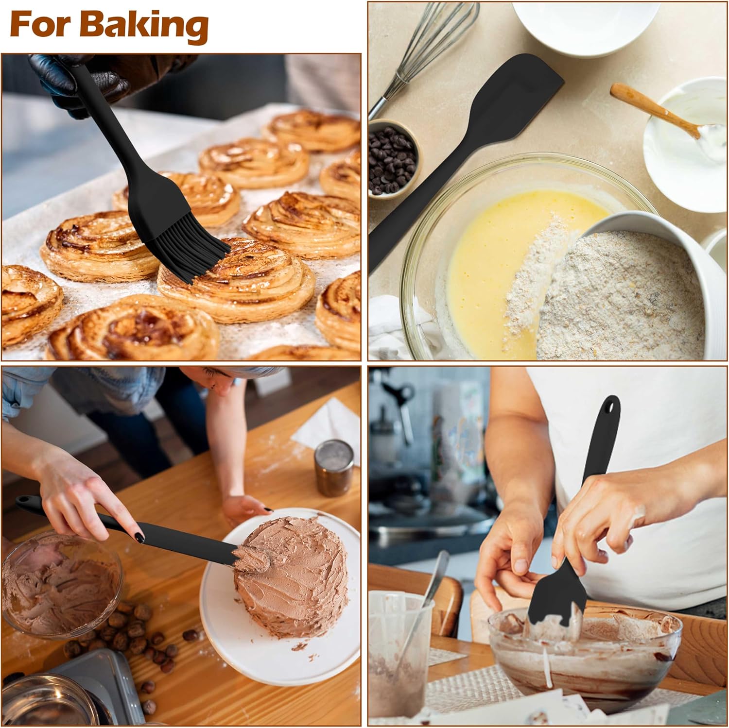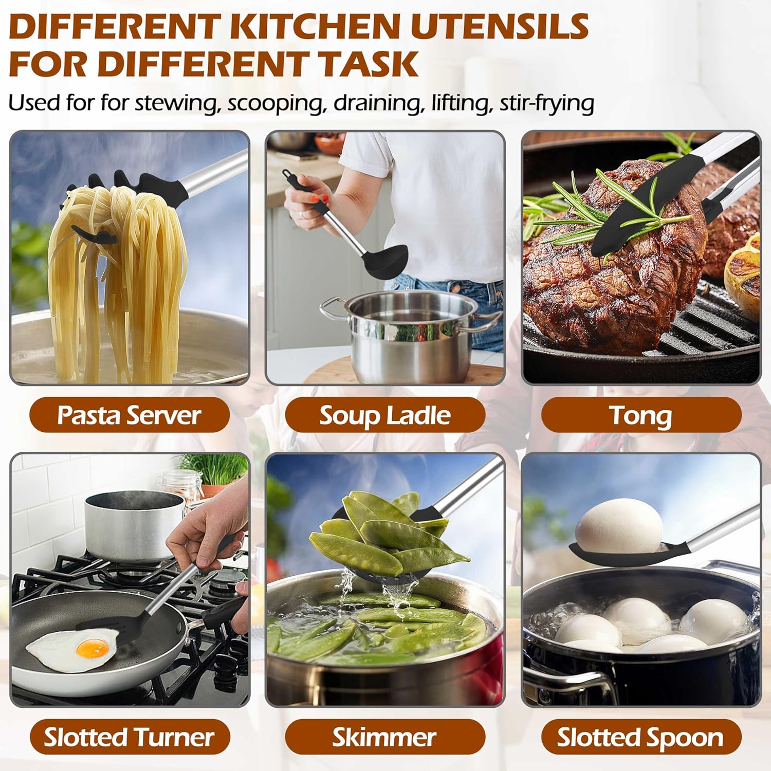 • HEAT-RESISTANT AND NON-SCRATCH: This kitchen utensils set with soft silicone head, withstand high temperatures (up to 450°F), not easy to bend, melt, or wrap when cooking, Anti-scratch to protect the surface of non-stick pans and cookware, extend the life of all your kitchen pots and pans, could meets all you kitchen cooking demands for stirring, baking, frying, boiling etc