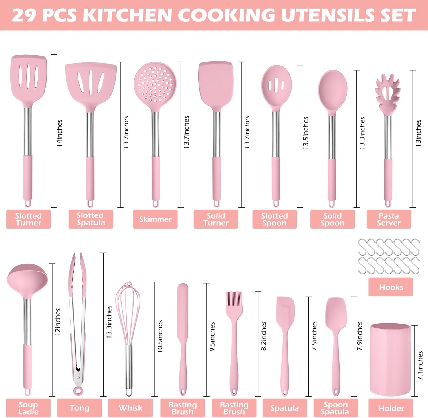 HaWare 29 PCS Silicone Cooking Utensils Set, Heat Resistant Kitchen Utensils Set with Stainless Steel Handle, Spatula Sets with Holder and Hooks, Kitchen Tools Gadgets for Nonstick Cookware -Pink