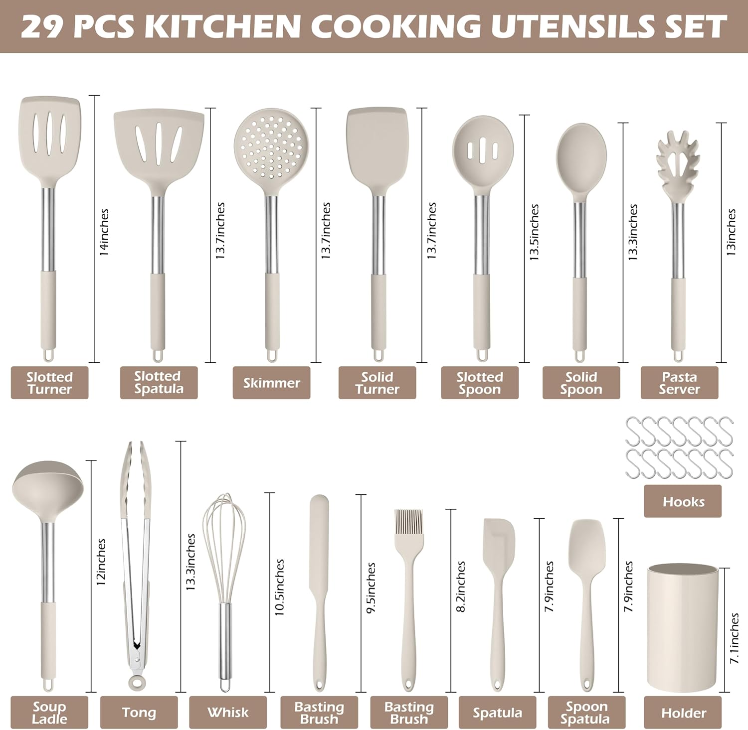HaWare 29 PCS Silicone Cooking Utensils Set, Heat Resistant Kitchen Utensils Set with Stainless Steel Handle, Spatula Sets with Holder and Hooks, Kitchen Tools Gadgets for Nonstick Cookware -Khaki