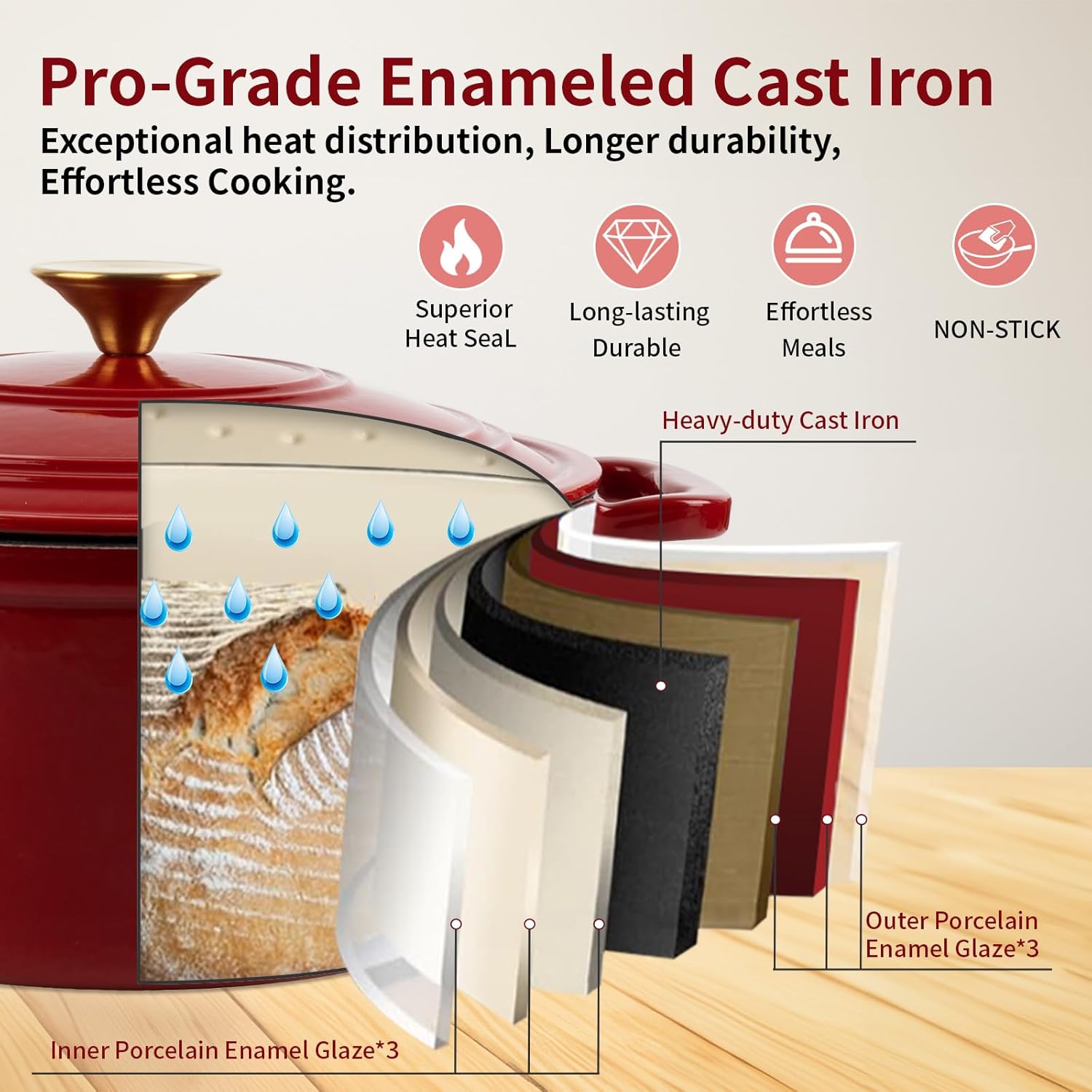 • 【Even Heat Distribution & Retention】Thick cast iron body ensures steady, uniform heating. Ideal for baking artisan bread, braising meats, simmering soups, or roasting vegetables with professional-level results.