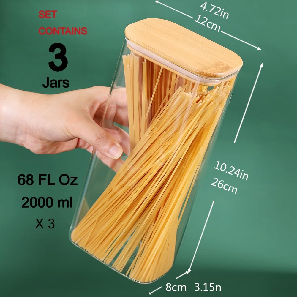 • 【3 Pack Glass Food Containers】 Package include 3 jars: 3 x 68oz /4.72*3.15*10.24inches, from grains and pasta to nuts and spices, these jars offer ample space while maximizing shelf or cabinet space. Keep your kitchen neat and tidy while adding a touch of elegance.