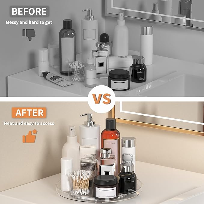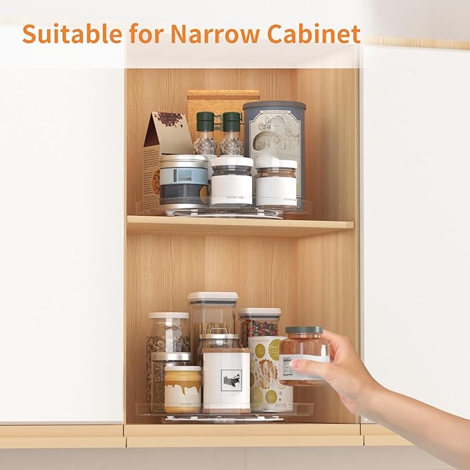 • Multiple Use: Suitable for kitchen seasoning storage, toiletries organization, limited cabinet storage, refrigerator drinks placement, etc. The turntable organizer is clear at a glance, making it easy to find the required items quickly