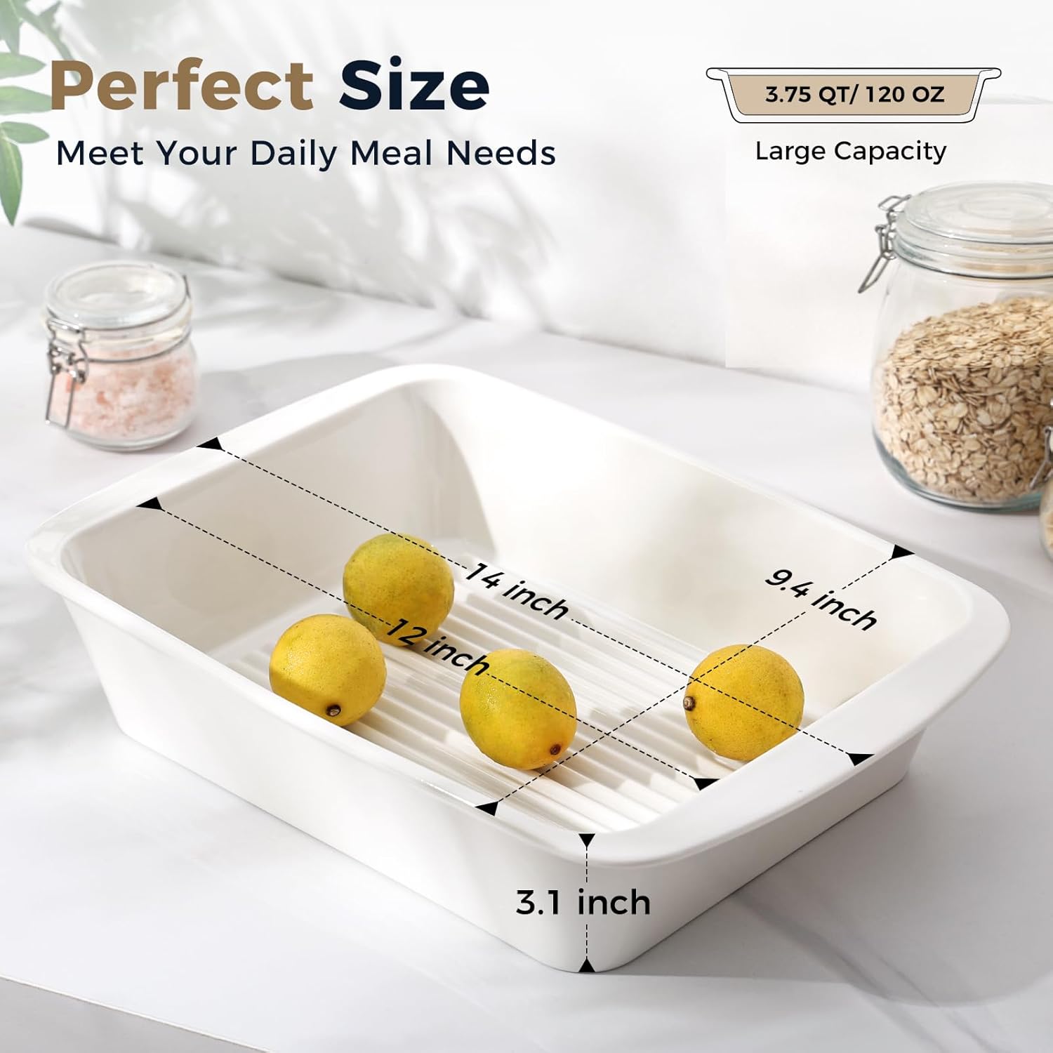 • 【Perfect Size for More Flavor】 Measuring 14"L × 9.4"W × 3.1"H (including handles), our generously sized ceramic baking dish is perfect for family dinners and serving. Its ideal dimensions accommodate a variety of dishes like lasagna, casseroles, roasted meats, bacon, and more.