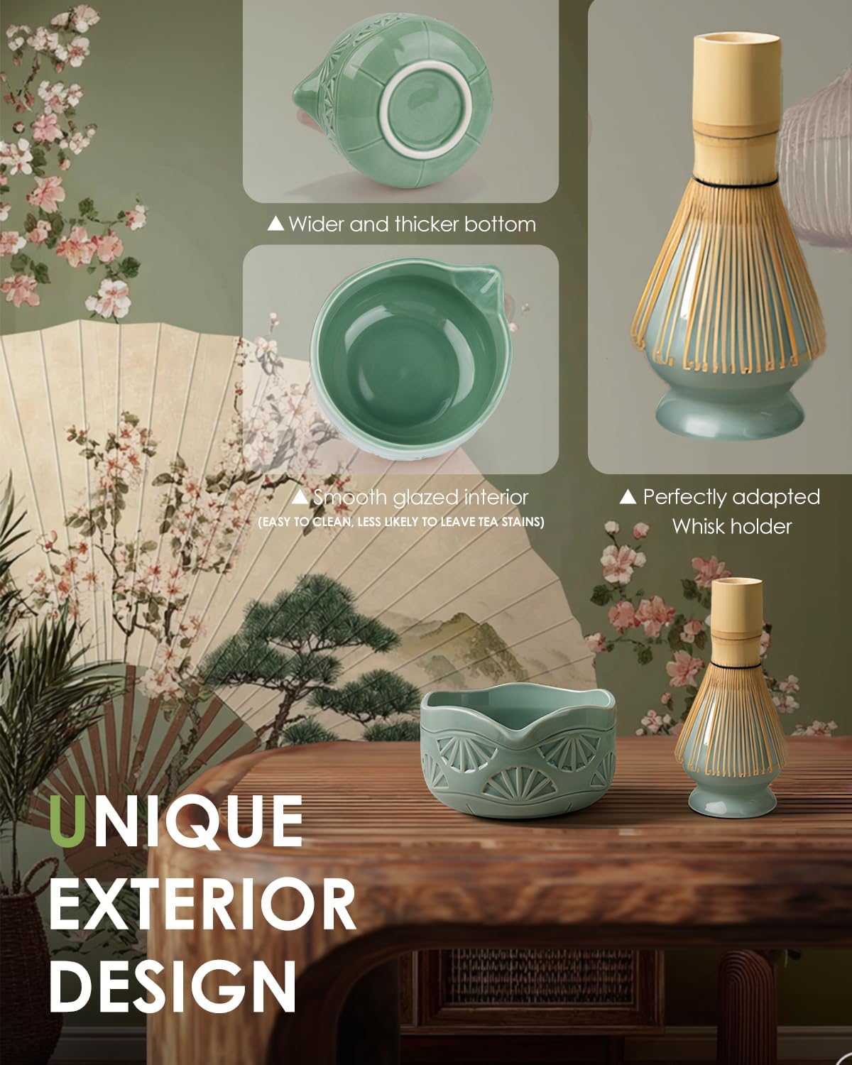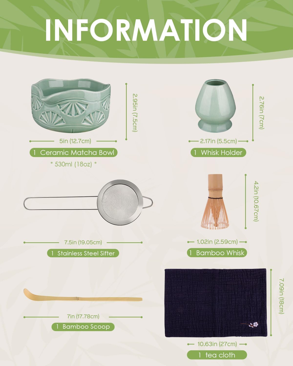 • Complete Matcha Set:This matcha set includes everything needed for an traditional matcha experience: - 1x handmade bamboo matcha whisk (chasen) - 1x bamboo scoop (chashaku) - 1x stainless steel sifter - 1x 530ml/18oz ceramic matcha bowl (chawan) - 1x whisk holder - 1x tea cloth - 1x Hand-Book