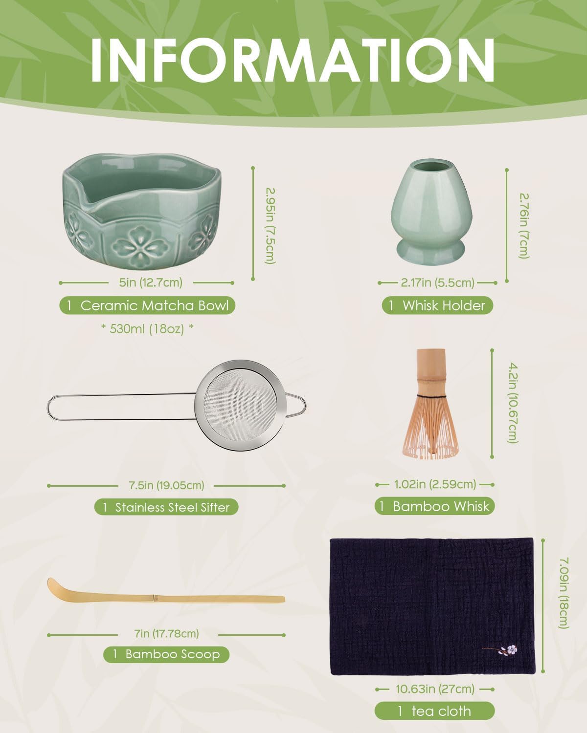 • Complete Matcha Set:This matcha set includes everything needed for an traditional matcha experience: - 1x handmade bamboo matcha whisk (chasen) - 1x bamboo scoop (chashaku) - 1x stainless steel sifter - 1x 530ml/18oz ceramic matcha bowl (chawan) - 1x whisk holder - 1x tea cloth - 1x Hand-Book